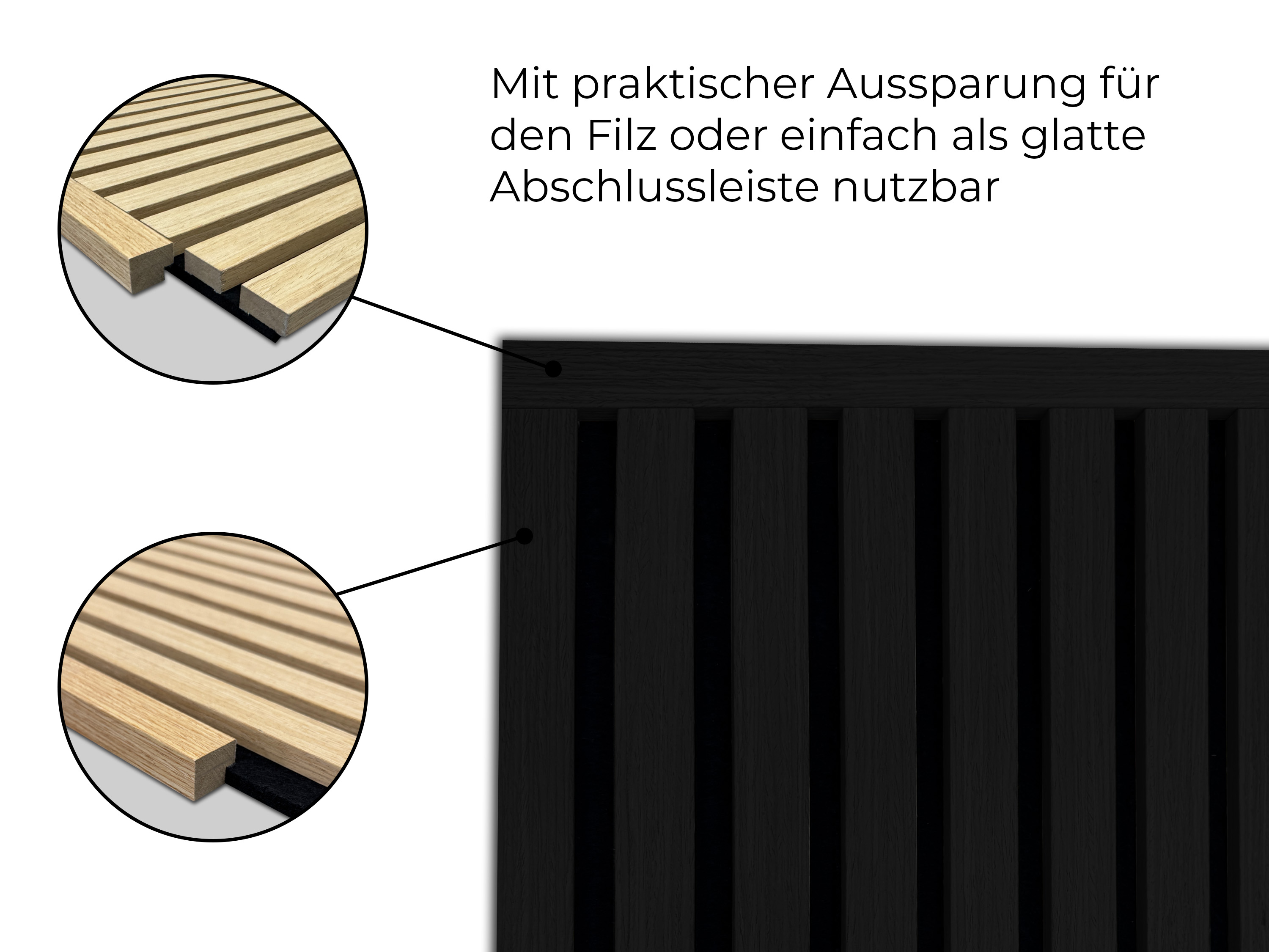 Die uficell Abschlussleiste aus MDF mit Echtholzfurnier sorgt für ein modernes, elegantes Ambiente und wertet alle Akustikpaneele auf. In allen verfügbaren Farben dekorgleich erhältlich, lässt sie sich flexibel einsetzen und ist besonders pflegeleicht sowie langlebig.