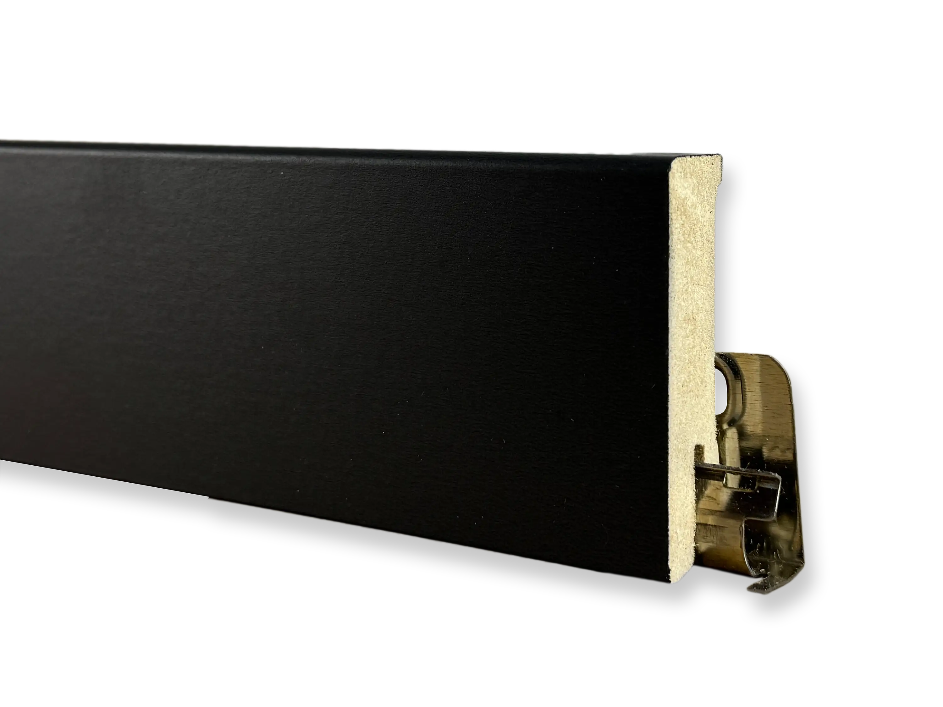 ***NEU*** Die elegante Wirkung dieser Fußleiste entsteht durch die schlichte rechteckige Formgebung. Sie wird auch als Bauhausleiste bezeichnet, da sie durch ihre puristische Art dem Bauhaus-Stil entspricht. Die Fußleiste hat einen MDF-Holzkern und ist schwarzer, strapazierfähiger Folie ummantelt.