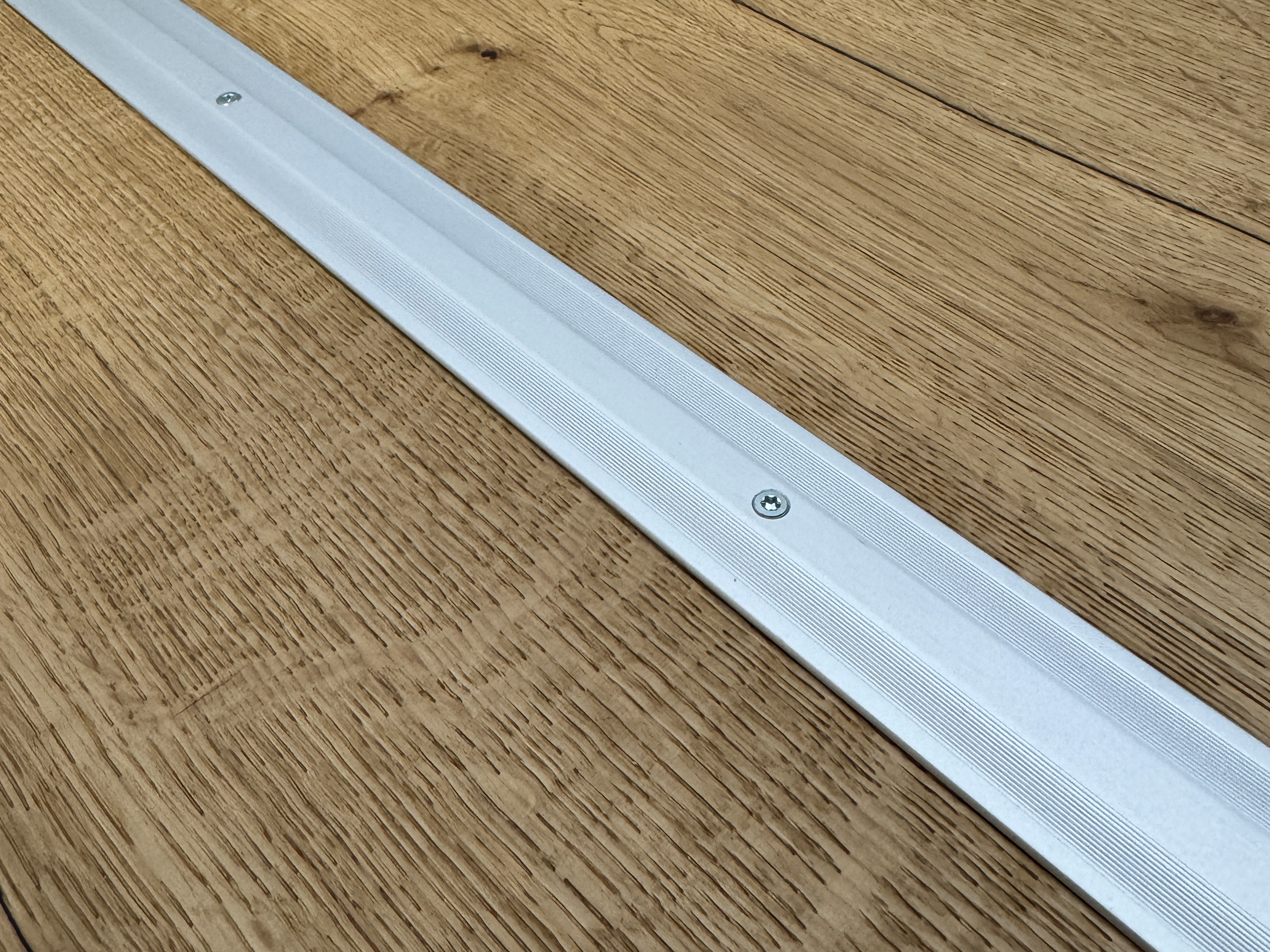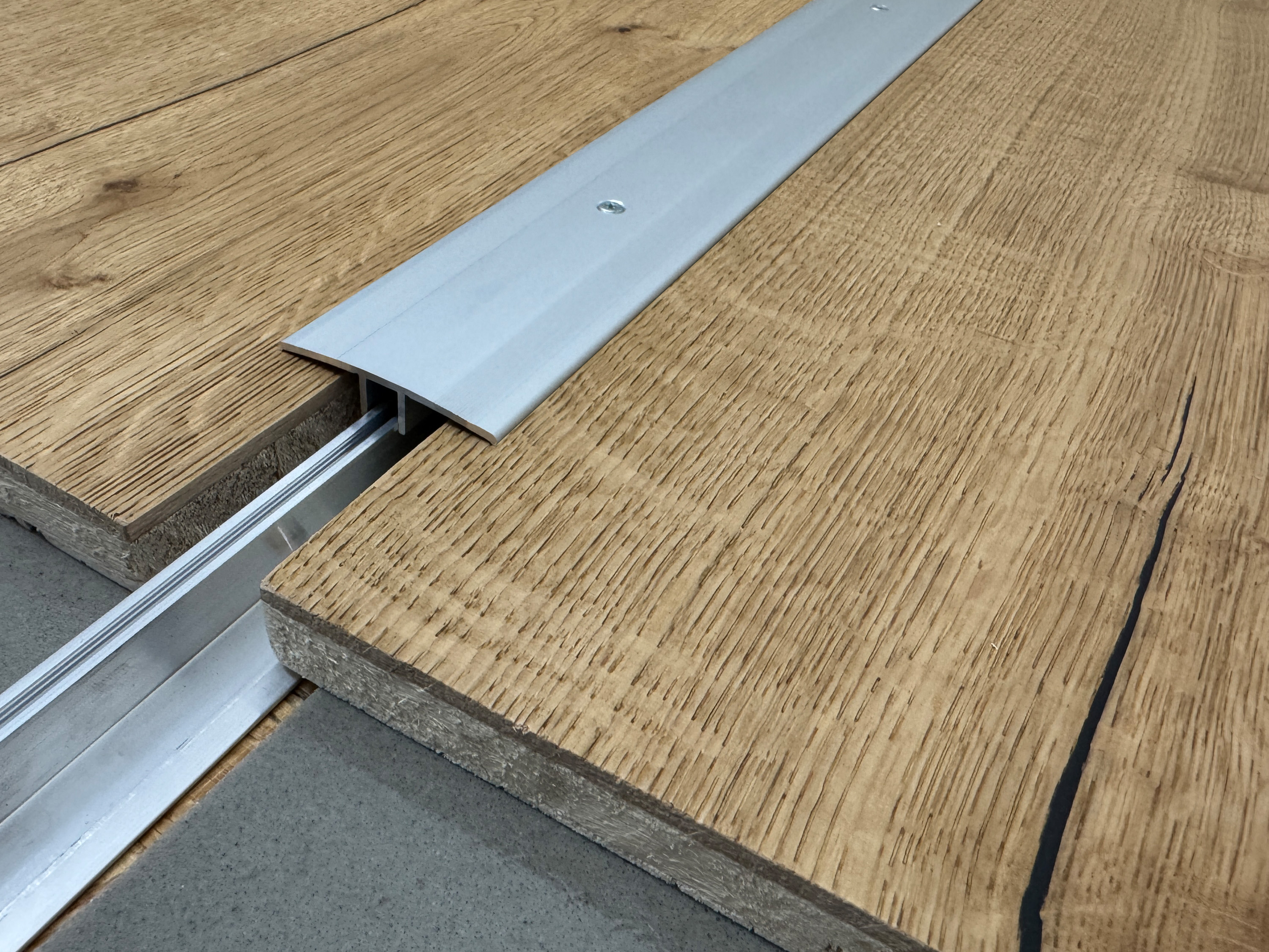 Äußerst stabiles Übergangsprofil für große Flächen, die durch eine Dehnungsfuge geteilt werden müssen oder für Türdurchgänge mit einer Belagshöhe von 14-21 mm. Durch die schmale Sichtbreite von nur 33 mm verschwindet das Profil bei geschlossenem Zustand der Tür unsichtbar darunter. Die spezielle Konstruktion (automatische Höheneinstellung) ermöglicht auch den Einsatz mit geringen Höhenunterschieden. Für etwas breitere Dehnungsfugen wurde die Serie mit einem 45 mm und 60 mm breiten Übergangsprofil Profil ergänzt.