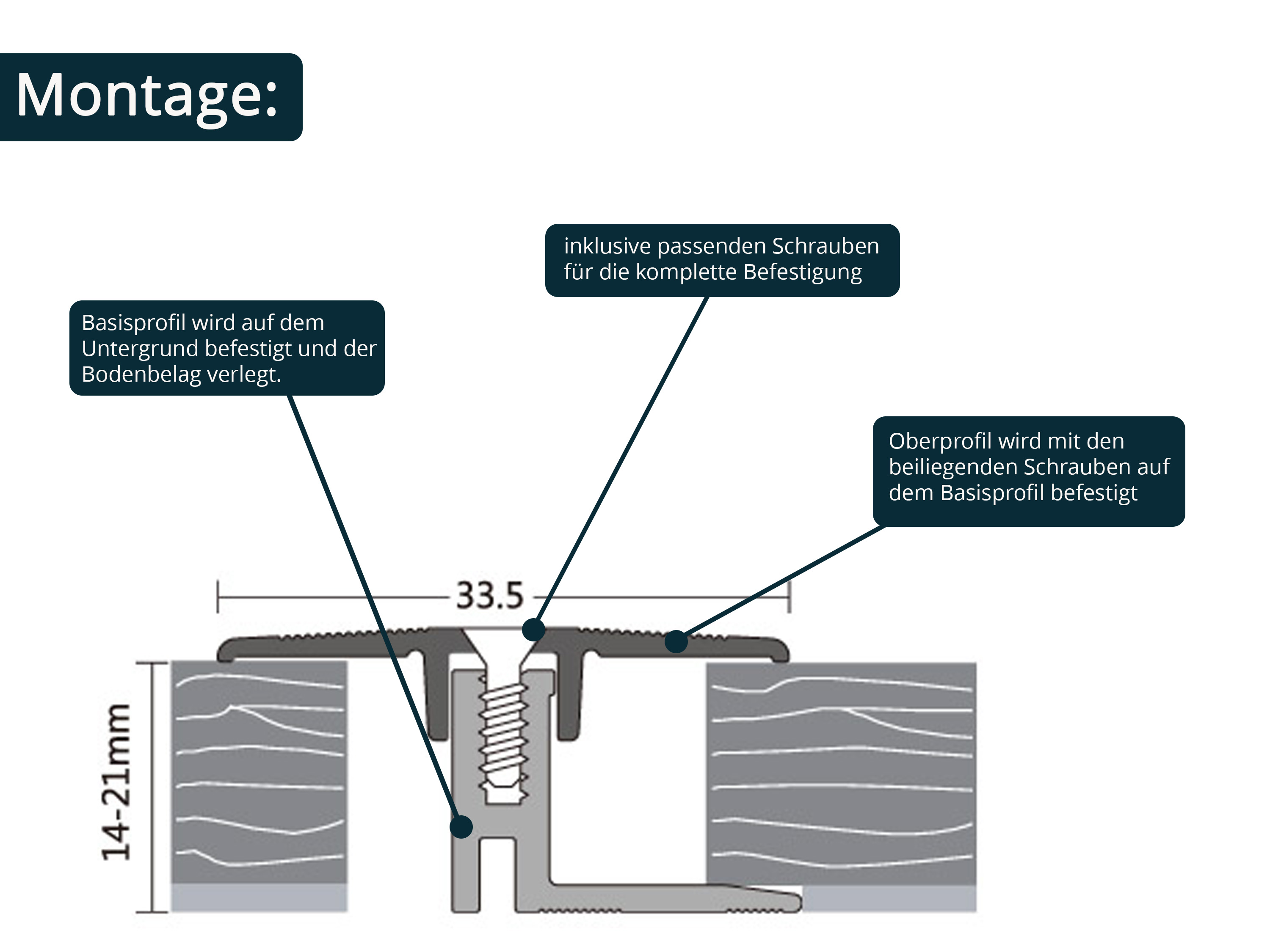 Äußerst stabiles 2-teiliges Abschlussprofil für den Abschluss von Laminat- oder Parkettböden an der Wand, Terrassentüren oder Türschwellen, Sichtbreite 21 mm. Durch die spezielle Konstruktion (automatische, stufenlose Höheneinstellung) für Böden mit einer Belagshöhe von 14-21 mm einsetzbar. Anwendung: Als erstes wird das Basisprofil auf dem Untergrund verschraubt bzw. bei Einsatz einer Warmwasser Fußbodenheizung nach erfolgter Grundierung auf dem Estrich mit Soudal High Tack Montagekleber verklebt. Nach erfolgter Verlegung des Fußbodens wird das Oberprofil auf das Basisprofil aufgelegt. Die beiden Stege greifen über den Schraubkanal des Basisprofils. Mit den beigefügten Schrauben wird es im Schraubkanal befestigt. TIPP: Es ist ratsam sich vom Oberteil des Profils ein kurzes Musterstück (etwa 2 cm) zum Verlegen abzuschneiden. Dadurch wird sichergestellt das die verlegenden Fußboden Dielen optimal zum Basisprofil (Abstand ca. 5-8 mm / Dehnungsfuge) und nicht zu kurz (Abdeckung Oberteil) geschnitten werden.