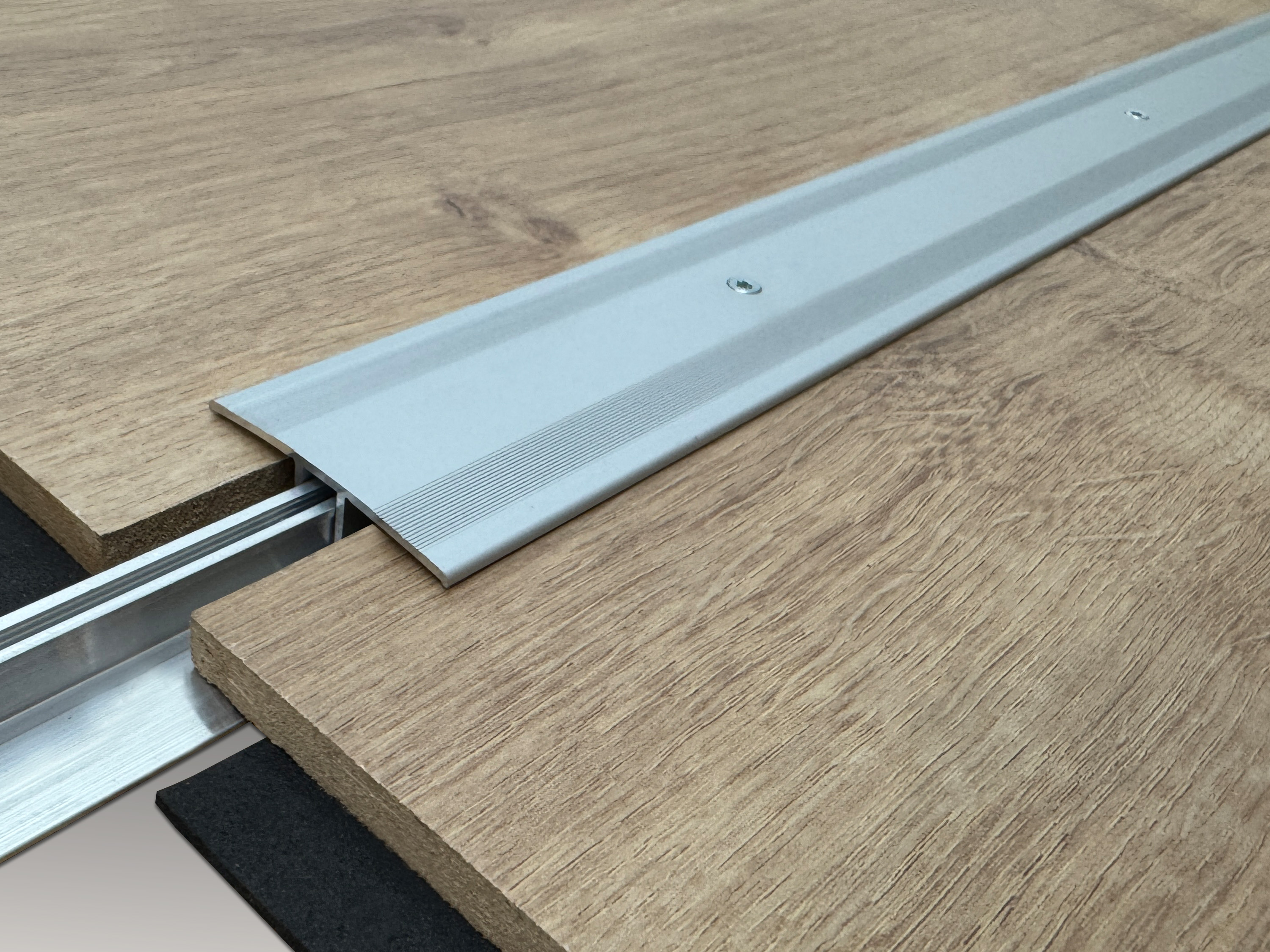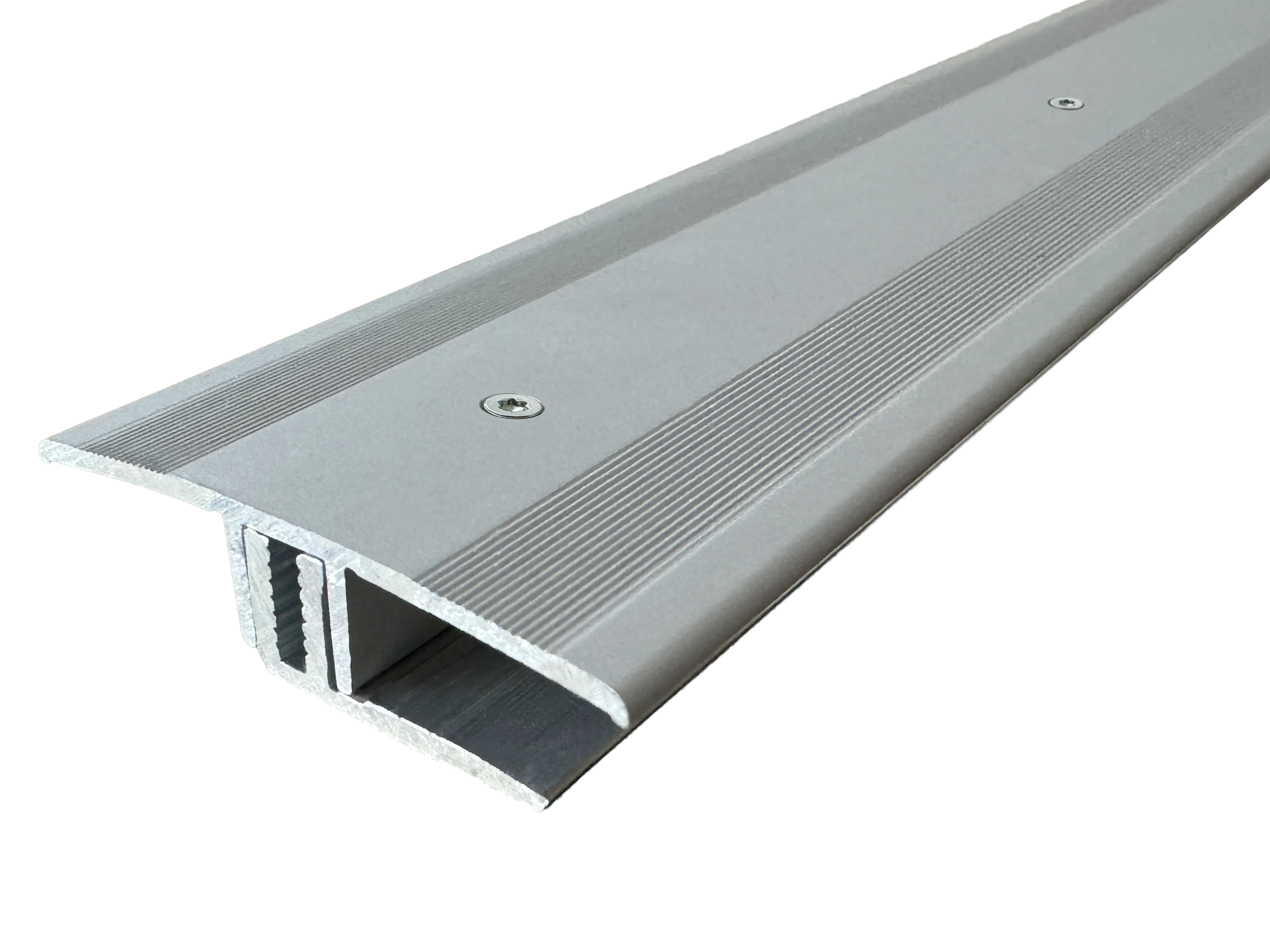 Äußerst stabiles Übergangsprofil für große Flächen, die durch eine Dehnungsfuge geteilt werden müssen oder für Türdurchgänge mit einer Belagshöhe von 7-16 mm. Durch die schmale Sichtbreite von nur 33 mm verschwindet das Profil bei geschlossenem Zustand der Tür unsichtbar darunter. Die spezielle Konstruktion (automatische Höheneinstellung) ermöglicht auch den Einsatz mit geringen Höhenunterschieden. Für etwas breitere Dehnungsfugen wurde die Serie mit einem 45 mm und 60 mm breiten Übergangsprofil Profil ergänzt.