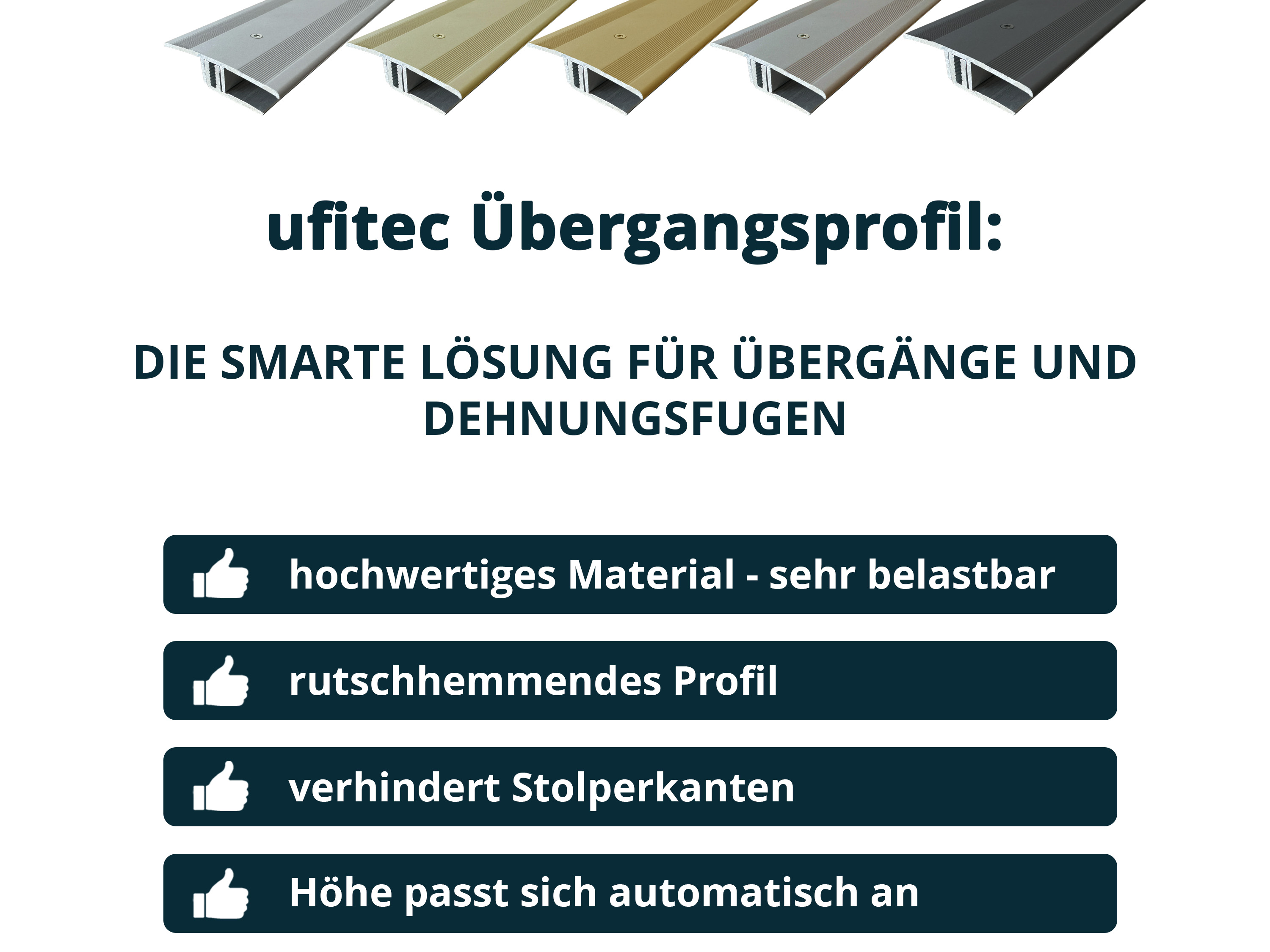 Das NEUE ufitec® TPL flex Dehnungsfugen-/Übergangsprofil kann für Hartbodenbeläge mit einer Belagsstärke von 7-16 mm eingesetzt werden. Durch die flexible 3 teilige Ausführung kann zusätzlich ein Höhenausgleich bis zu 5 mm problemlos mit einem Profil dezent überbrückt werden. Unser ufitec® TPL flex Übergangsprofil werden Ober- und Unterteil mit den mitgelieferten Schrauben verbunden. Die Schrauben erzielen einen optimalen Halt und garantieren das der Bodenbelag zwischen den Flex Profil sich perfekt bewegen kann (Dehnungsfuge). Das Profil eignet sich zwecks breiten Basisprofil nicht für die Nachträgliche Montage. Bei Fußbodenheizung empfiehlt sich das Basisprofil mit unseren Montagekleber Soudal® FIX ALL TURBO zu montieren (Klebestelle 2-3 Std. vorher mit Tiefengrund vorbehandeln) um Schäden an der Heizung zu vermeiden. Der Einsatzbereich unseres ufitec® TPL flex liegt meistens zwischen Türdurchgängen oder wo der Bodenbelag endet, Überbrückt (Laminat auf Fliese) oder die Sichtkante geschützt werden muss. Das ufitec® TPL flex Übergangprofil erhalten Sie in den Eloxalfarben – Silber, Gold, Gold Hell, Bronze Hell und Bronze Dunkel. Es stehen 3 Längen in 90, 100 und 270 cm zur Verfügung.