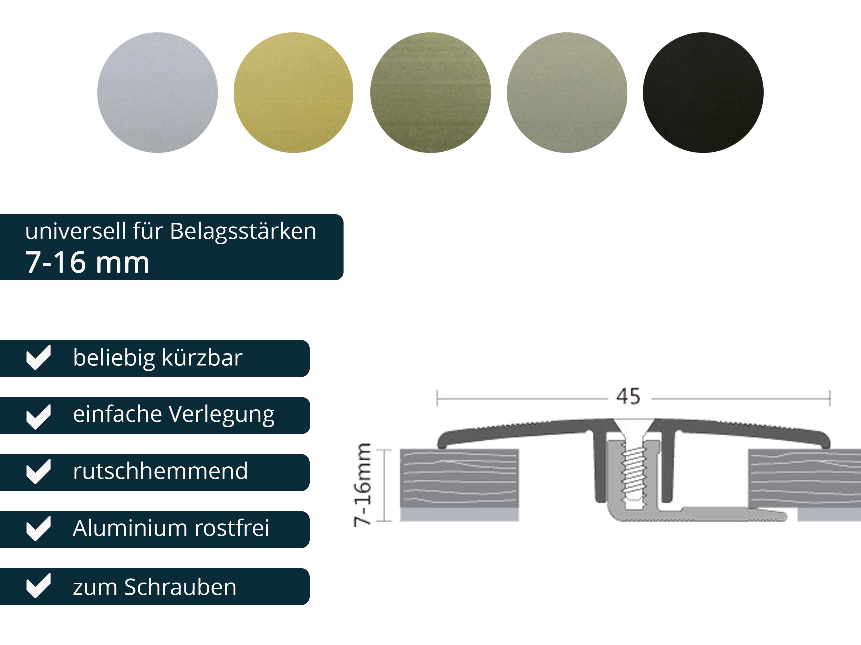 45 mm breites Übergangsprofil für große Flächen, die durch eine Dehnungsfuge geteilt werden müssen oder für Türdurchgänge mit einer Belagshöhe von 7-16 mm