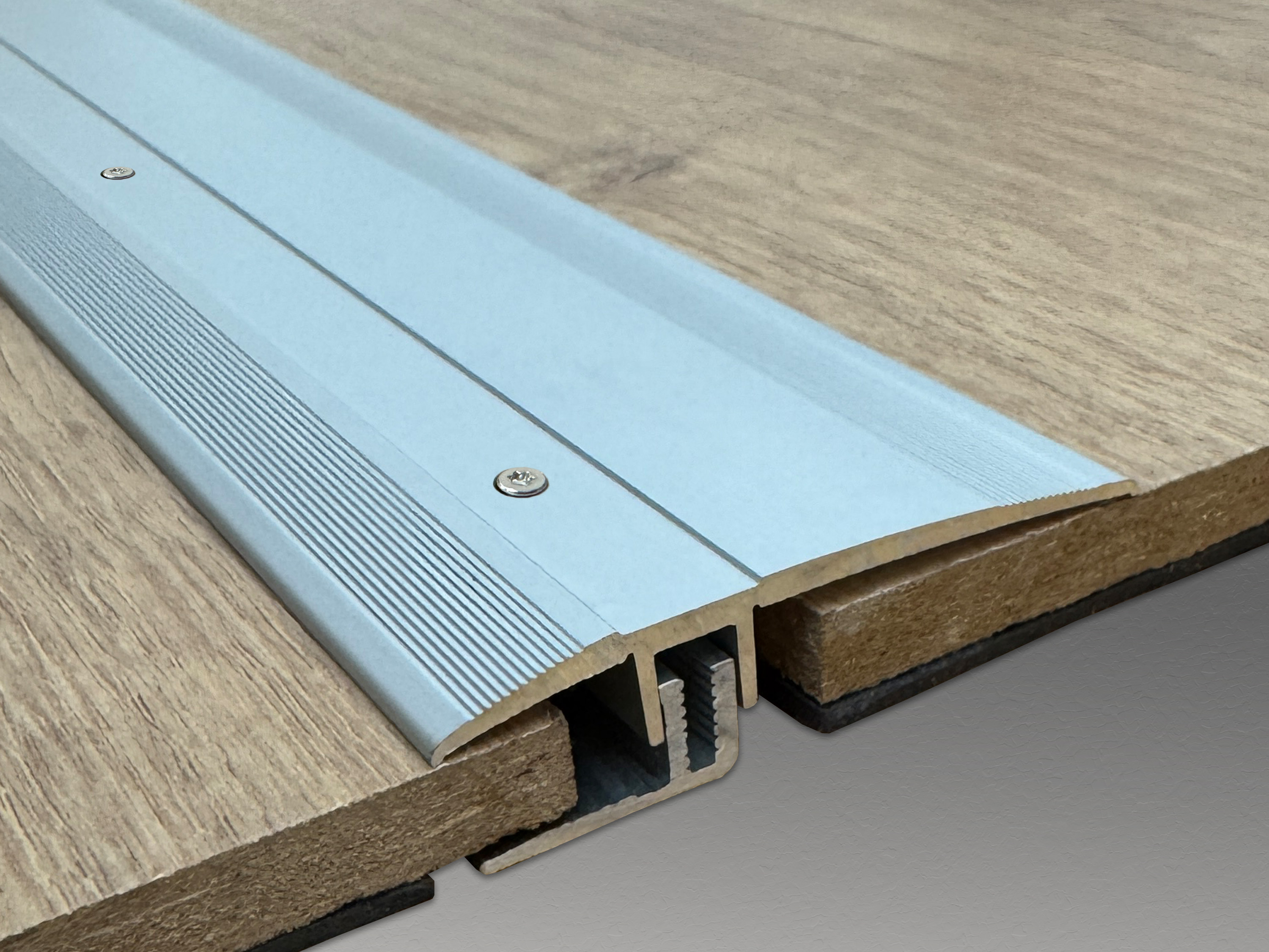 Äußerst stabiles Übergangsprofil für große Flächen, die durch eine Dehnungsfuge geteilt werden müssen oder für Türdurchgänge mit einer Belagshöhe von 7-16 mm. Durch die schmale Sichtbreite von nur 33 mm verschwindet das Profil bei geschlossenem Zustand der Tür unsichtbar darunter. Die spezielle Konstruktion (automatische Höheneinstellung) ermöglicht auch den Einsatz mit geringen Höhenunterschieden. Für etwas breitere Dehnungsfugen wurde die Serie mit einem 45 mm und 60 mm breiten Übergangsprofil Profil ergänzt.