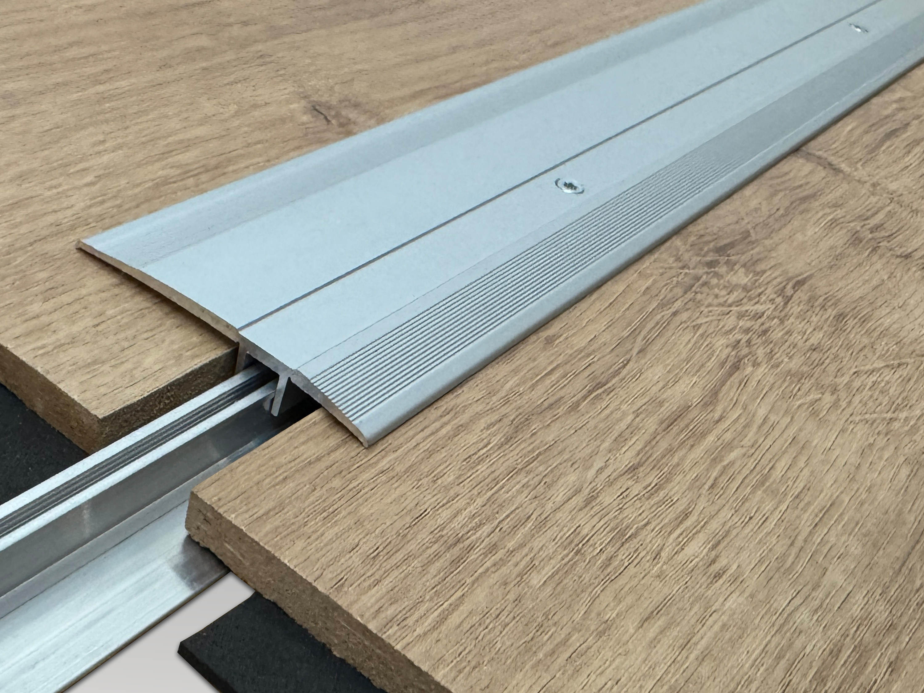 Äußerst stabiles Übergangsprofil für große Flächen, die durch eine Dehnungsfuge geteilt werden müssen oder für Türdurchgänge mit einer Belagshöhe von 7-16 mm. Durch die schmale Sichtbreite von nur 33 mm verschwindet das Profil bei geschlossenem Zustand der Tür unsichtbar darunter. Die spezielle Konstruktion (automatische Höheneinstellung) ermöglicht auch den Einsatz mit geringen Höhenunterschieden. Für etwas breitere Dehnungsfugen wurde die Serie mit einem 45 mm und 60 mm breiten Übergangsprofil Profil ergänzt.