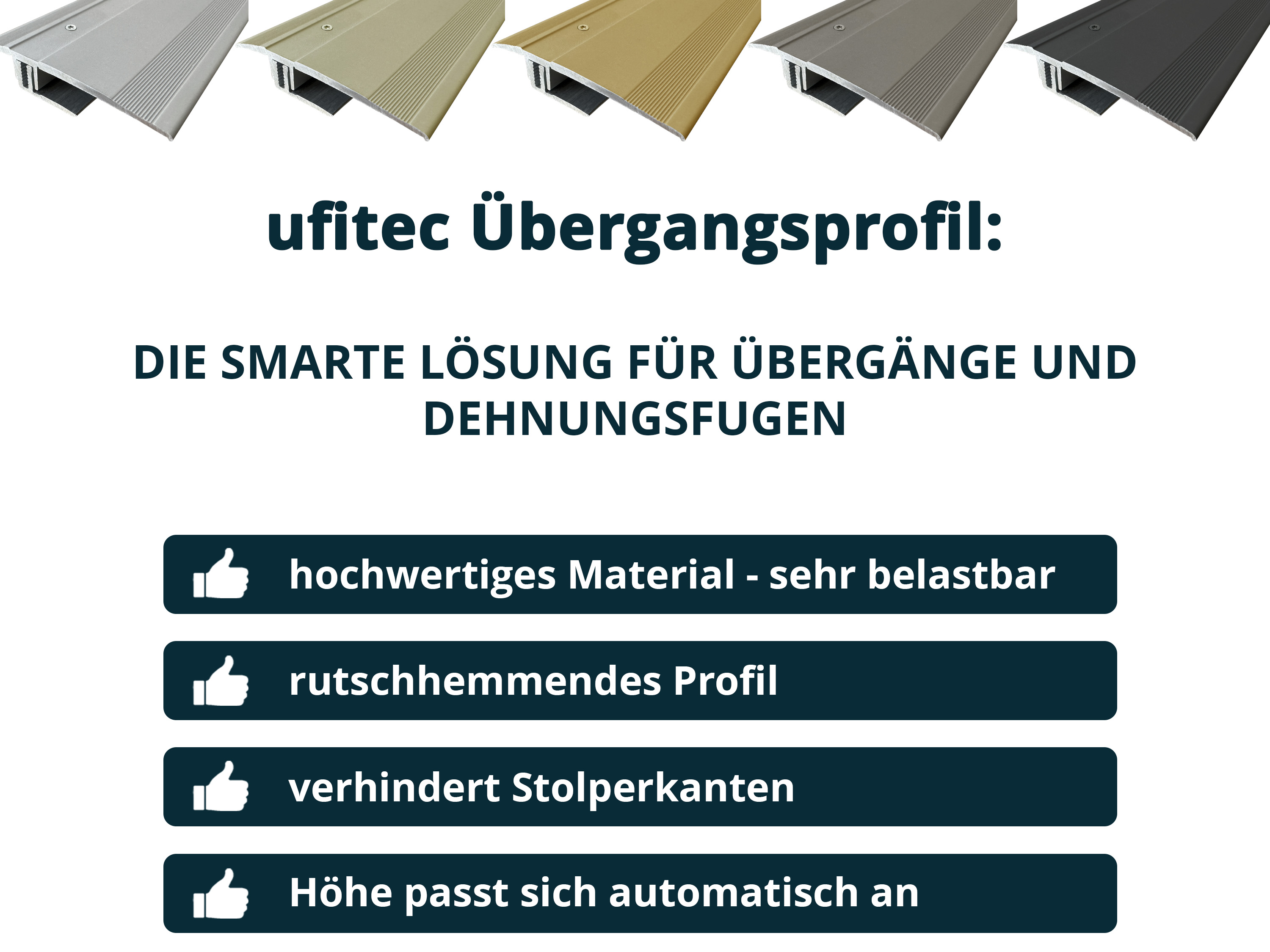 Das ufitec® TPL Profi Profilsystem wurde speziell für die Verlegung von unterschiedlich starken Laminat-, Parkett-, Vinyl-, Furnier- und Korkböden mit einer Bodenbelagsstärke von 7-16 mm entwickelt. Das technisch innovative Profilsystem steht in dezenter optischer Ausführung als Abschluss-, Übergangs-, Anpassungsprofil und Treppenwinkel zur Verfügung und wird in 5 Aluminium angeboten. Der Clou – alle Profile sind automatisch Höhenverstellbar. Bei unserer neuesten Generation ufitec® TPL Profi flex wird durch einfache mechanische Anpassung ein Höhenausgleich von bis zu 6 mm erreicht.