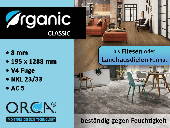Die Orca Trägerplatte, wird durch ein spezielles organisches Bindemittel erreicht, die jede Faser umschließt und so die Wasseraufnahme verhindert. Diese Technologie bietet bis zu 100 Stunden Spritzwasserschutz und ist damit ideal für Küchen und andere Nassbereiche. Jede Holzfaser wird durch ein speziell entwickeltes organisch-chemisches Bindemittel umschlossen und kapselt diese gegen Feuchtigkeit ab. Die Produkte sind hitze- und UV-beständig und eignen sich daher perfekt für sonnige Räume. Bei Organic werden organische Inhaltsstoffe mit einer speziellen Technologie widerstandsfähig gegen Flüssigkeiten gemacht.