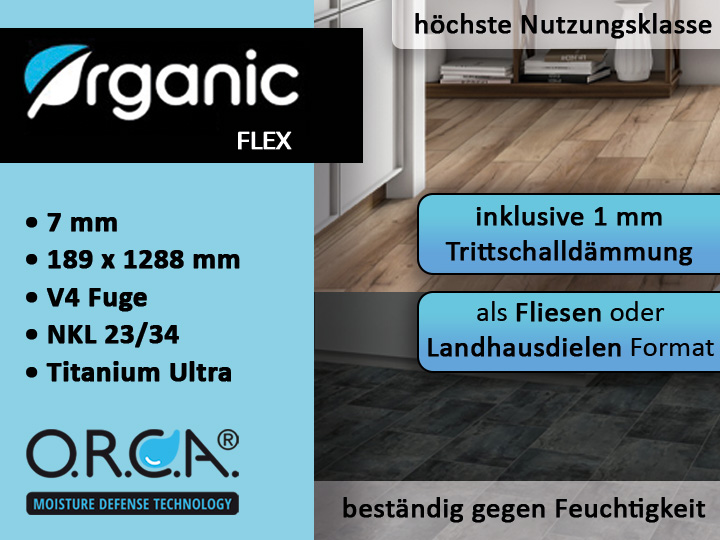 Das innovative O.R.C.A. Board macht es möglich, den Organic Boden auch in privaten Bädern zu verlegen, was bisher nur Vinyl oder Fliesen vorbehalten war. Hinzu kommen seine ausgezeichnete thermische Stabilität und Lichtechtheit, aufgrund der der Organic Boden sogar in Wintergärten und Räumen mit bodentiefen Fenstern eine gute Figur macht.