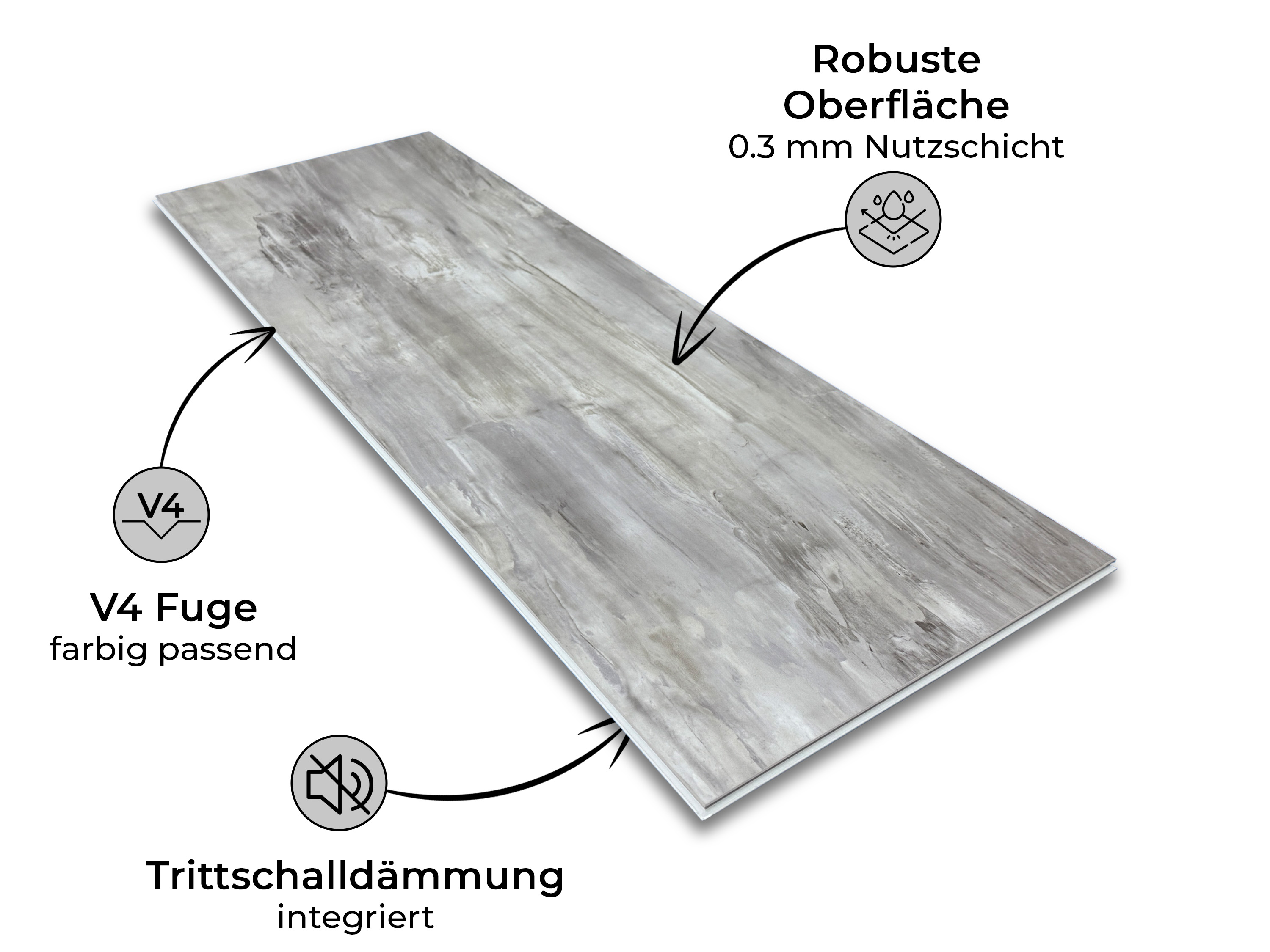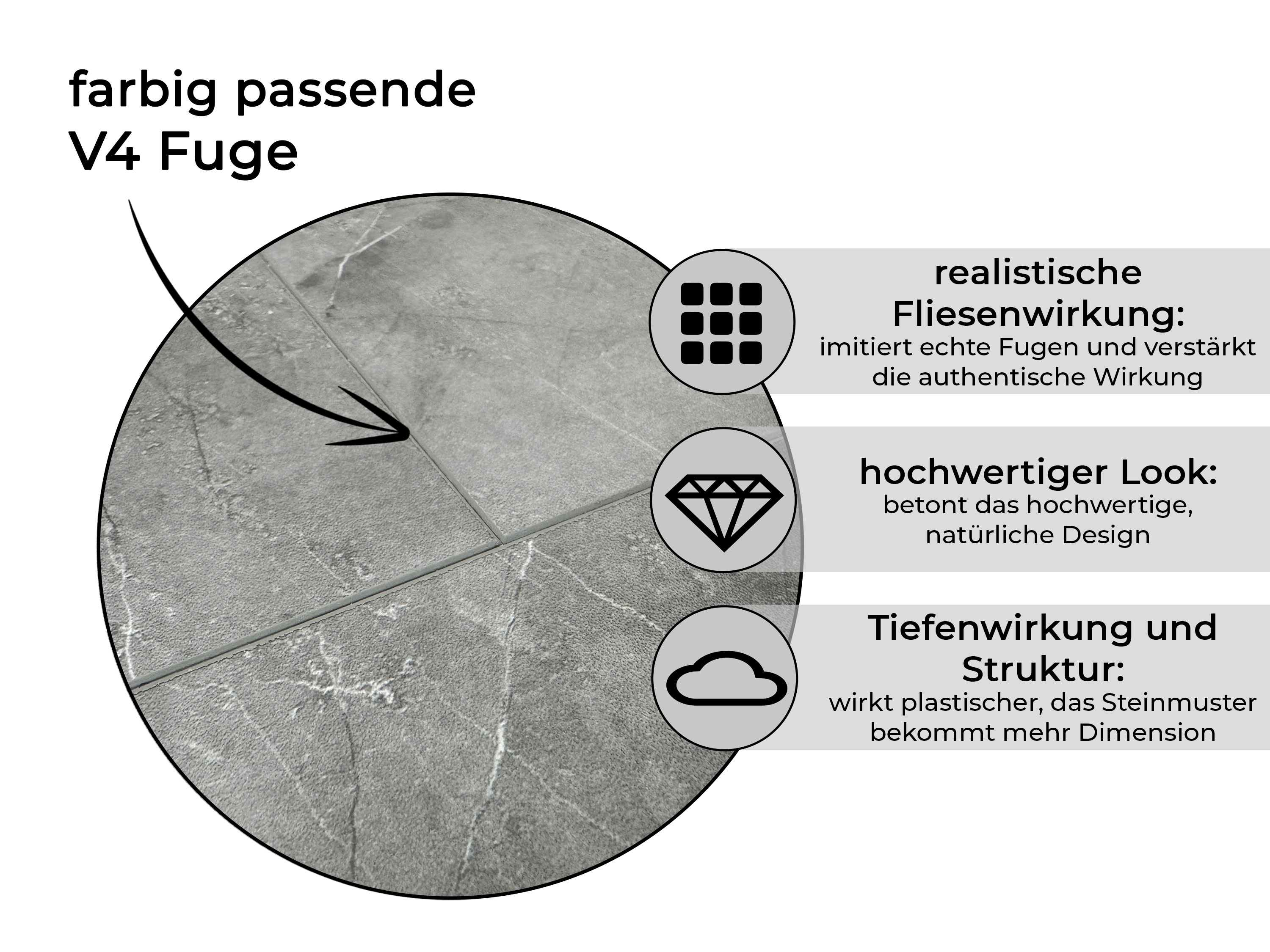 Klick Vinyl im Fliesendekor für moderne Optik und Haptik - mit farbiger V4 Fuge und integrierter Trittschalldämmung. Mineralisch formstabile Trägerplatte (SPC) - Stärke: 5 mm mit 0,30 mm Nutzschicht, NKL 23/32
