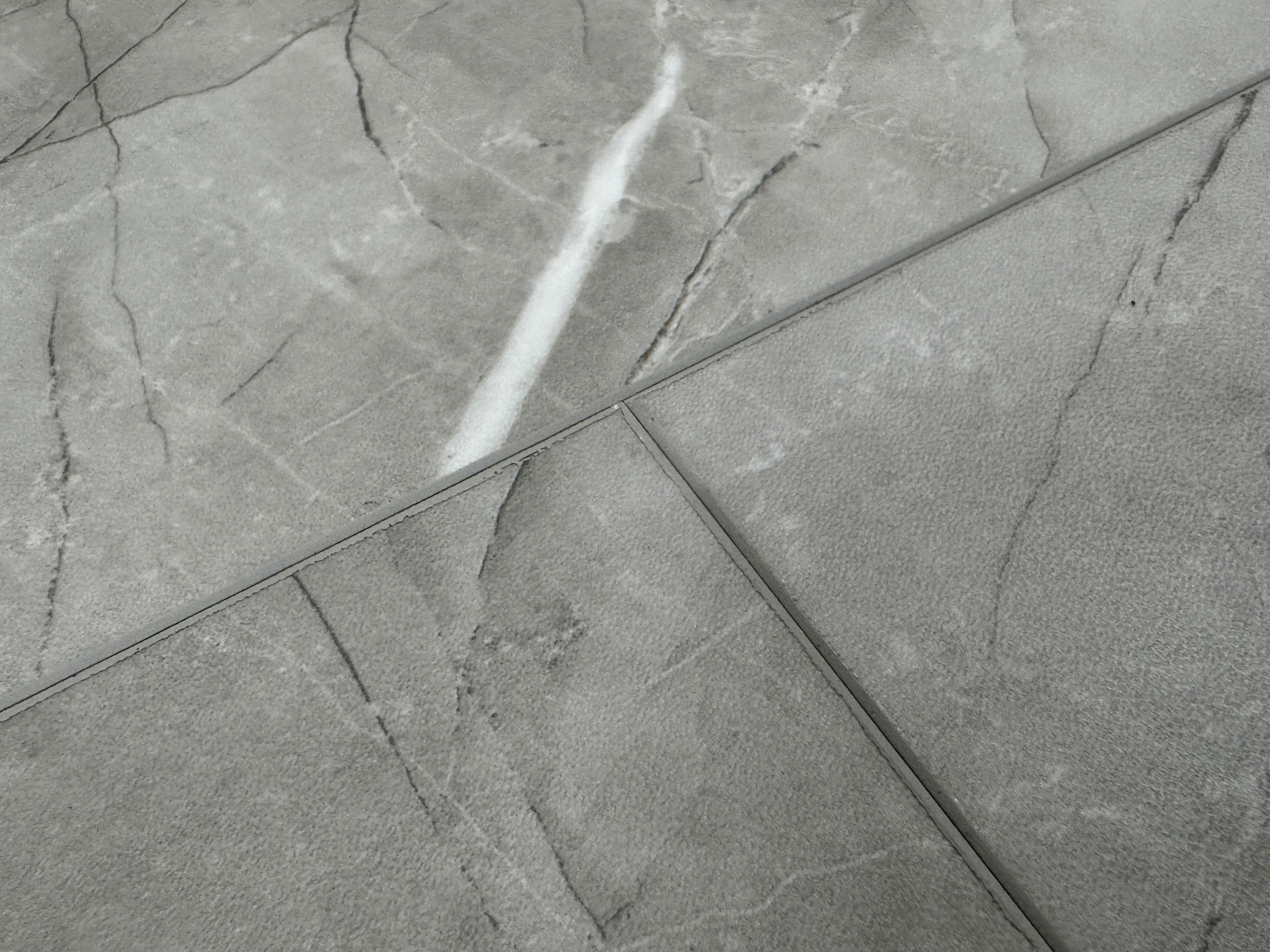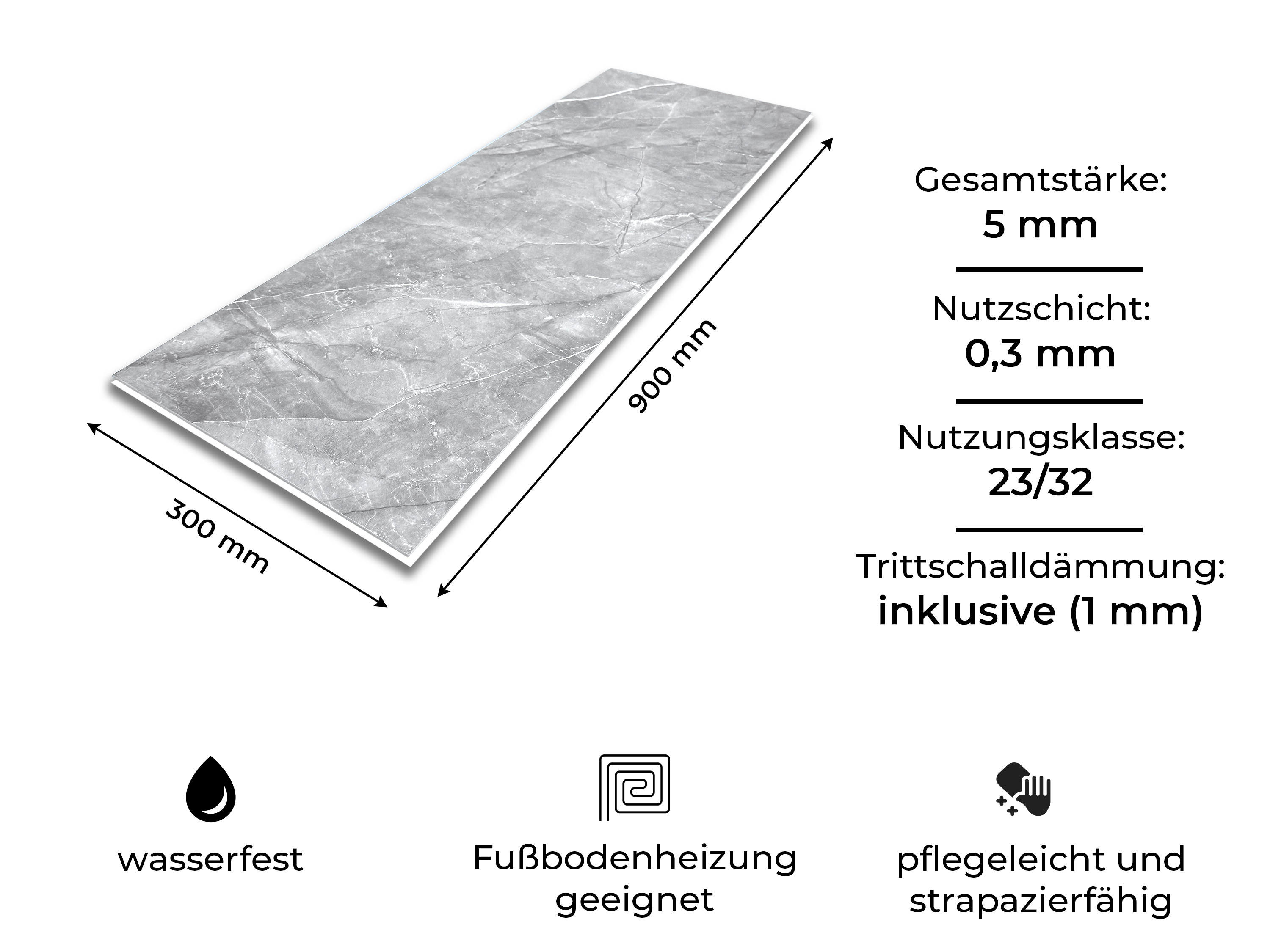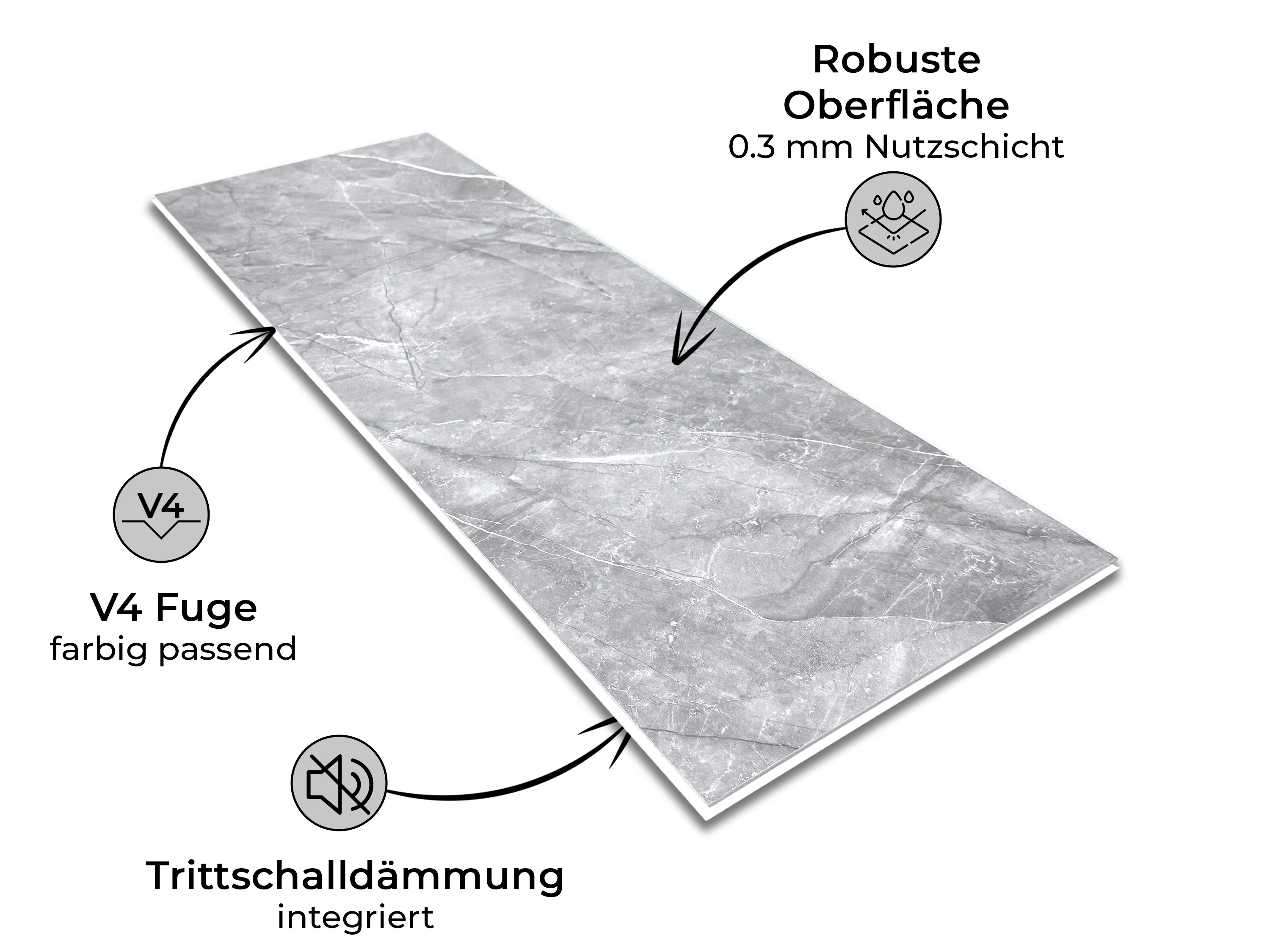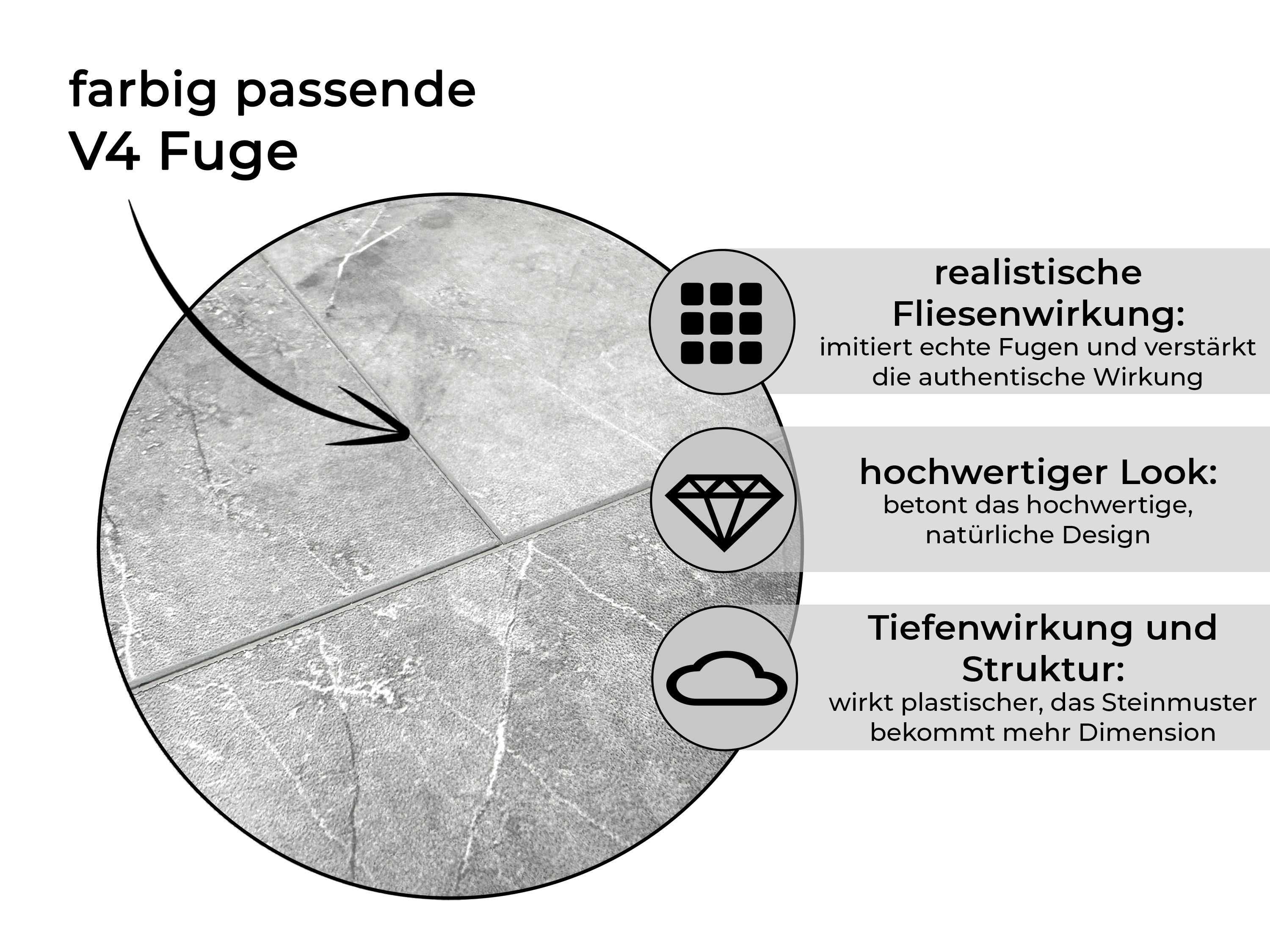 Klick Vinyl im Fliesendekor für moderne Optik und Haptik - mit farbiger V4 Fuge und integrierter Trittschalldämmung. Mineralisch formstabile Trägerplatte (SPC) - Stärke: 5 mm mit 0,30 mm Nutzschicht, NKL 23/32