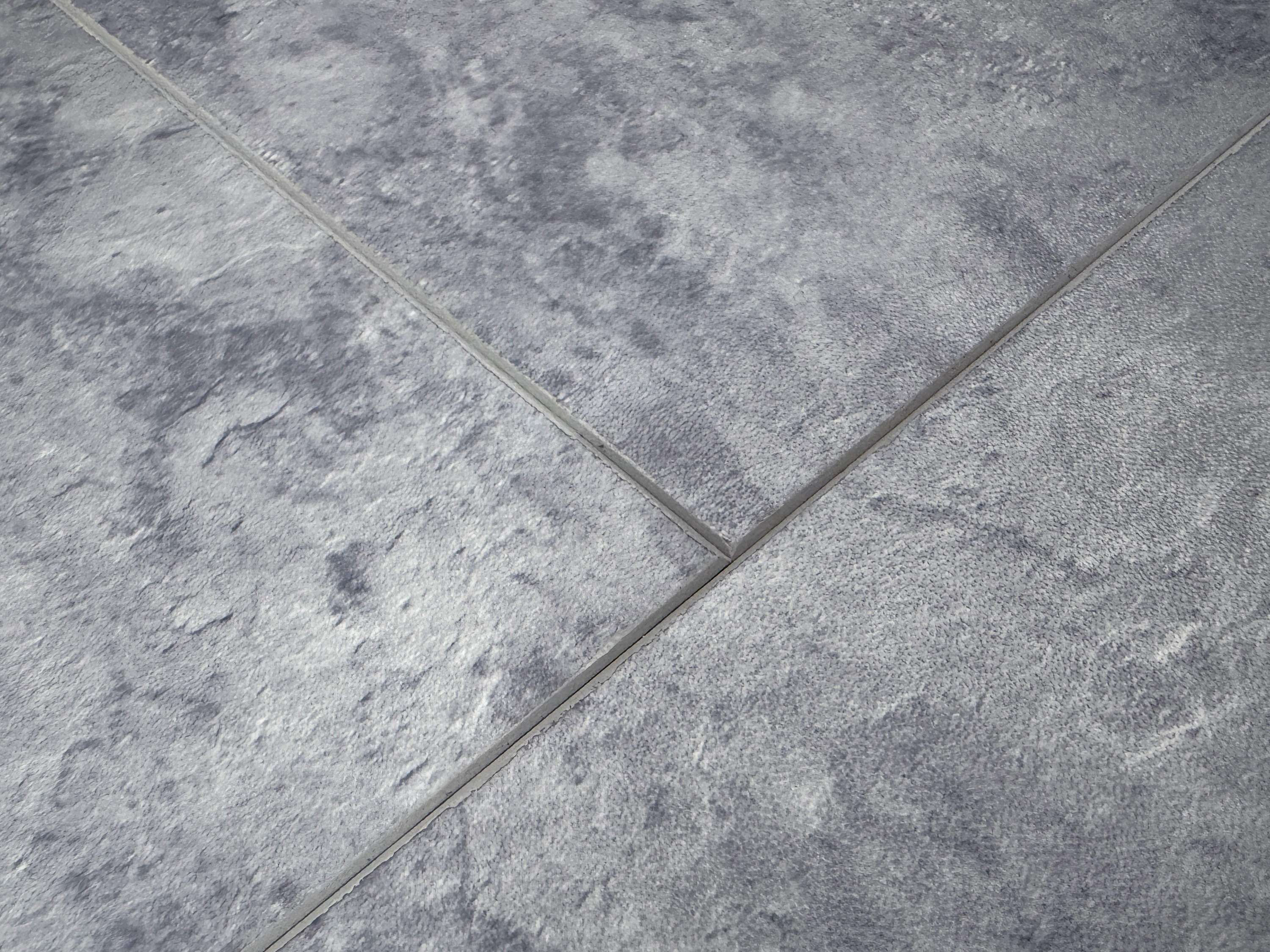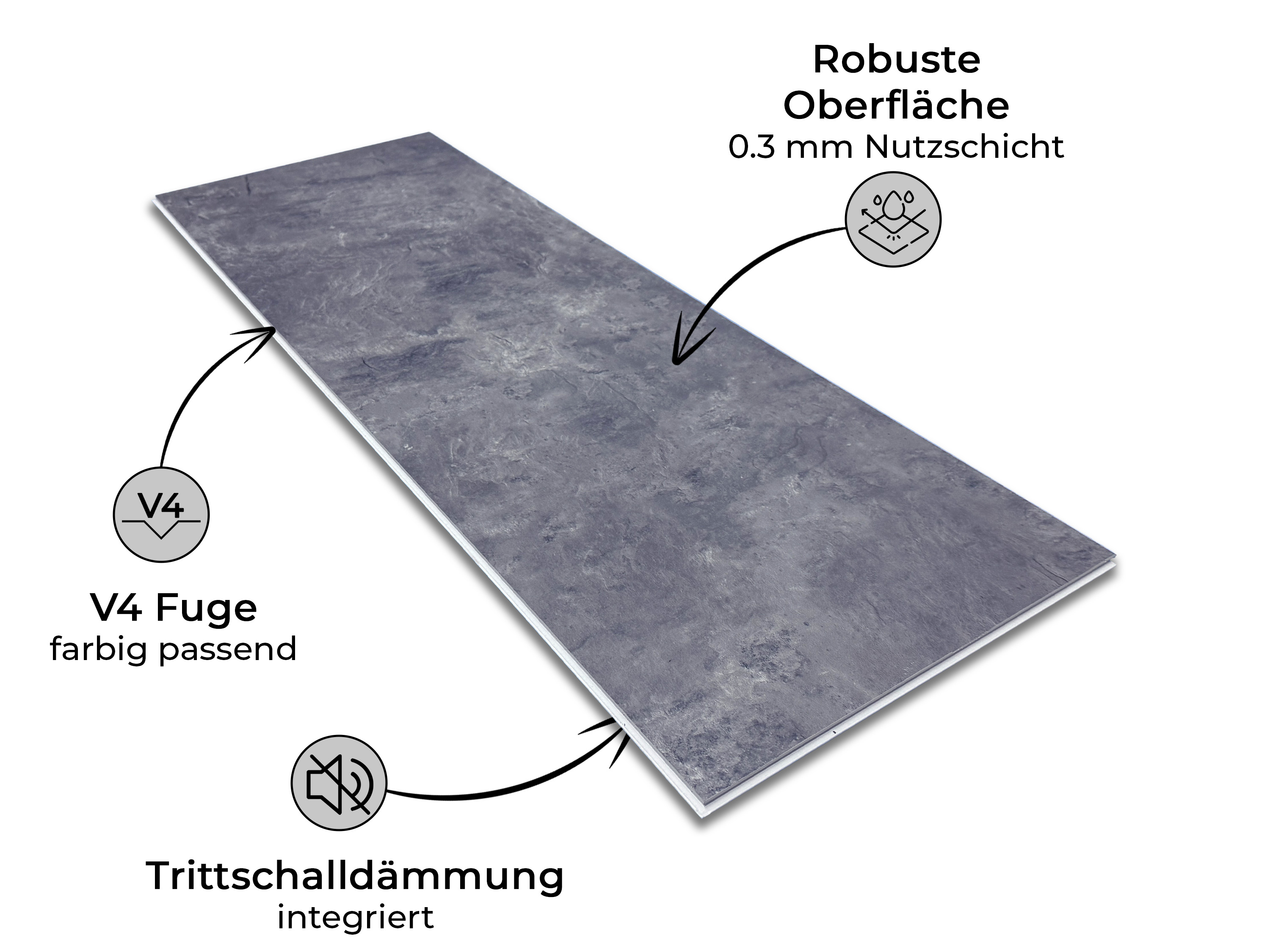 Klick Vinyl im Fliesendekor für moderne Optik und Haptik - mit farbiger V4 Fuge und integrierter Trittschalldämmung. Mineralisch formstabile Trägerplatte (SPC) - Stärke: 5 mm mit 0,30 mm Nutzschicht, NKL 23/32