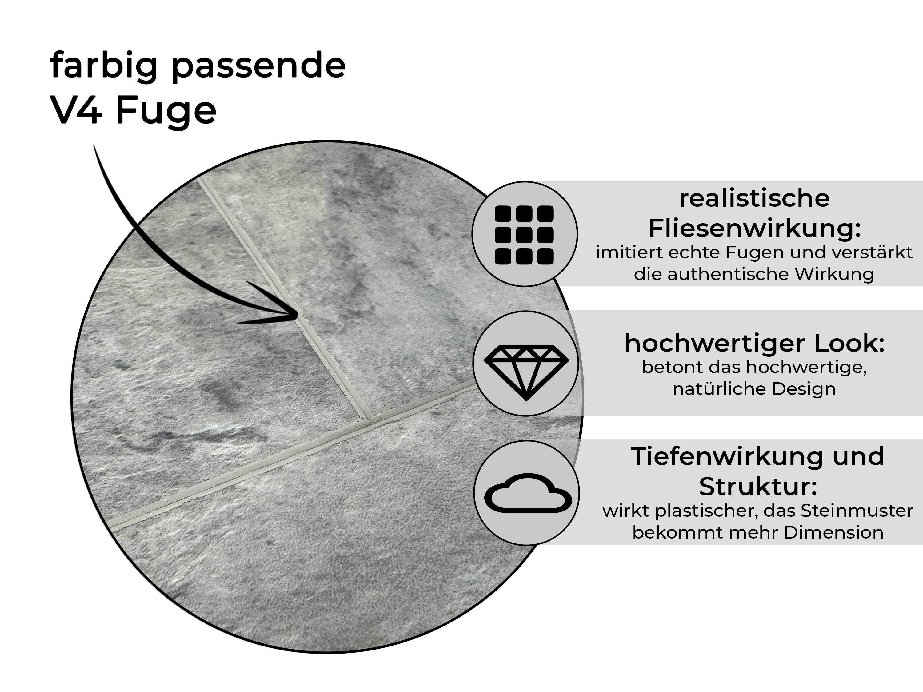 Klick Vinyl im Fliesendekor für moderne Optik und Haptik - mit farbiger V4 Fuge und integrierter Trittschalldämmung. Mineralisch formstabile Trägerplatte (SPC) - Stärke: 5 mm mit 0,30 mm Nutzschicht, NKL 23/32