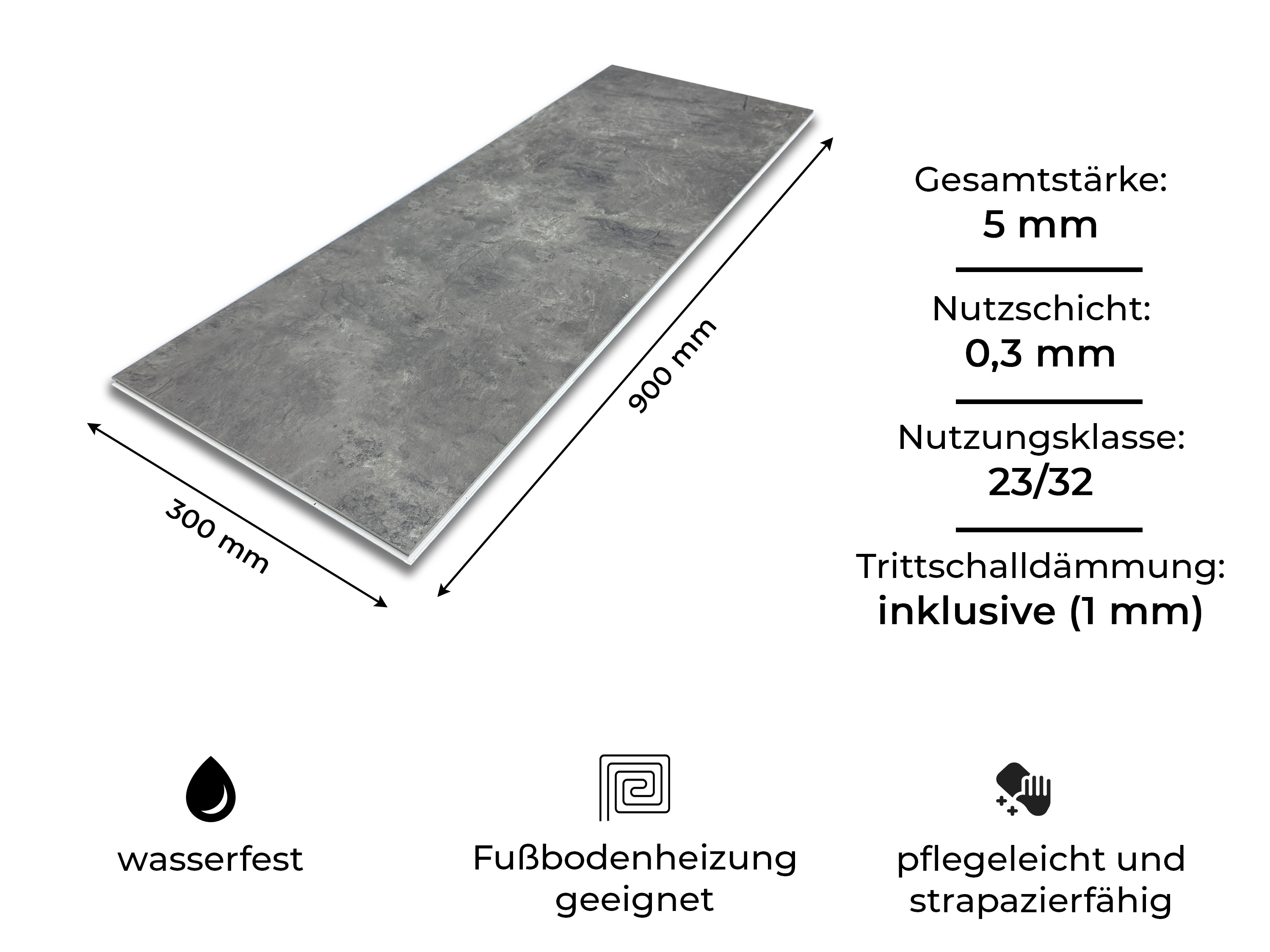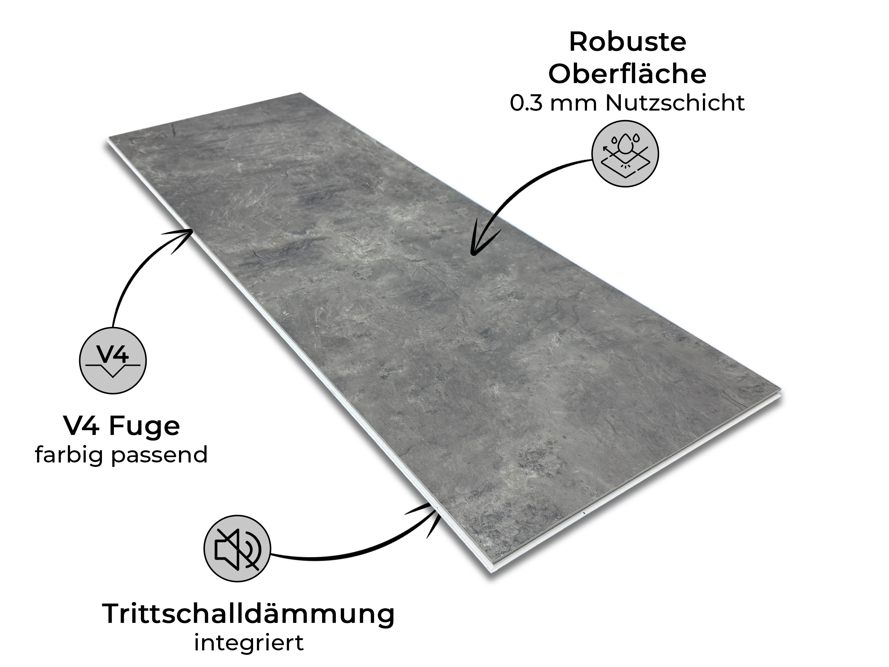 Klick Vinylboden Loft Grey Fliesendekor SPC Klickvinyl 5 mm stark mit Trittschalldämmung - farbige V4 Fuge