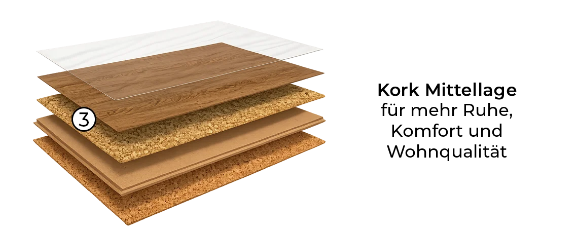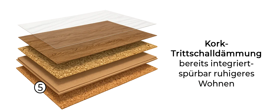 Die elastische Korkstruktur sorgt für spürbare Schalldämmung und ein angenehm weiches Gehgefühl – ideal für ruhige, gemütliche Wohnräume.