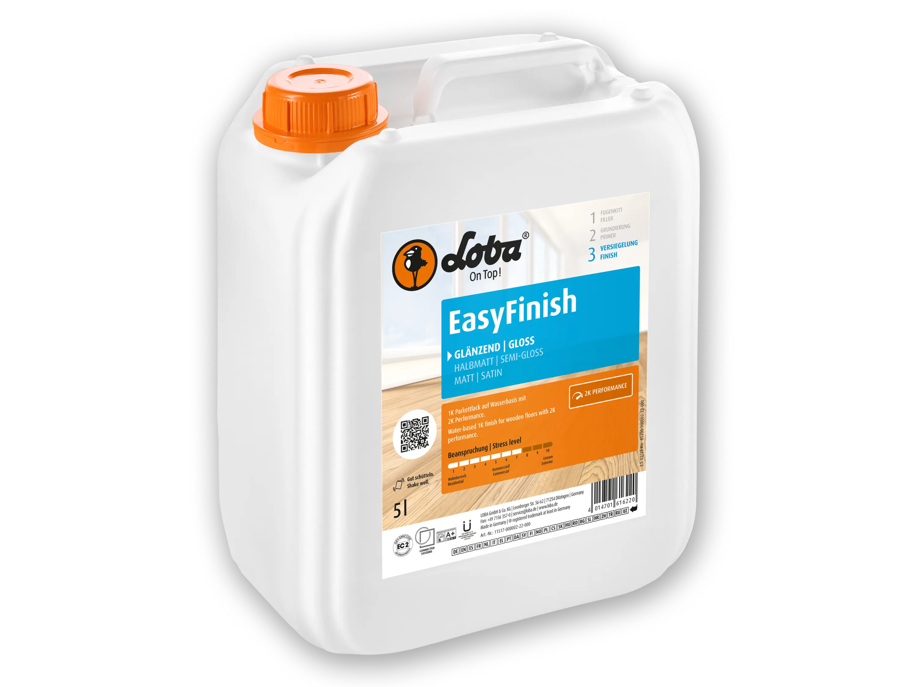 LOBADUR® WS EasyFinish ist ein hochwertiger Parkettlack der Premium Klasse. Damit bieten wir auch im Bereich der hochwertigen 1K-PU-Acrylat-Wassersiegel neueste Technologien an. Die Vorteile in der Übersicht: Sehr gute Chemikalien- und Abriebsbeständigkeit. Aufgrund hervorragender Elastizität auch für Kork geeignet. Einsatzbereich: normale bis starke Beanspruchung.