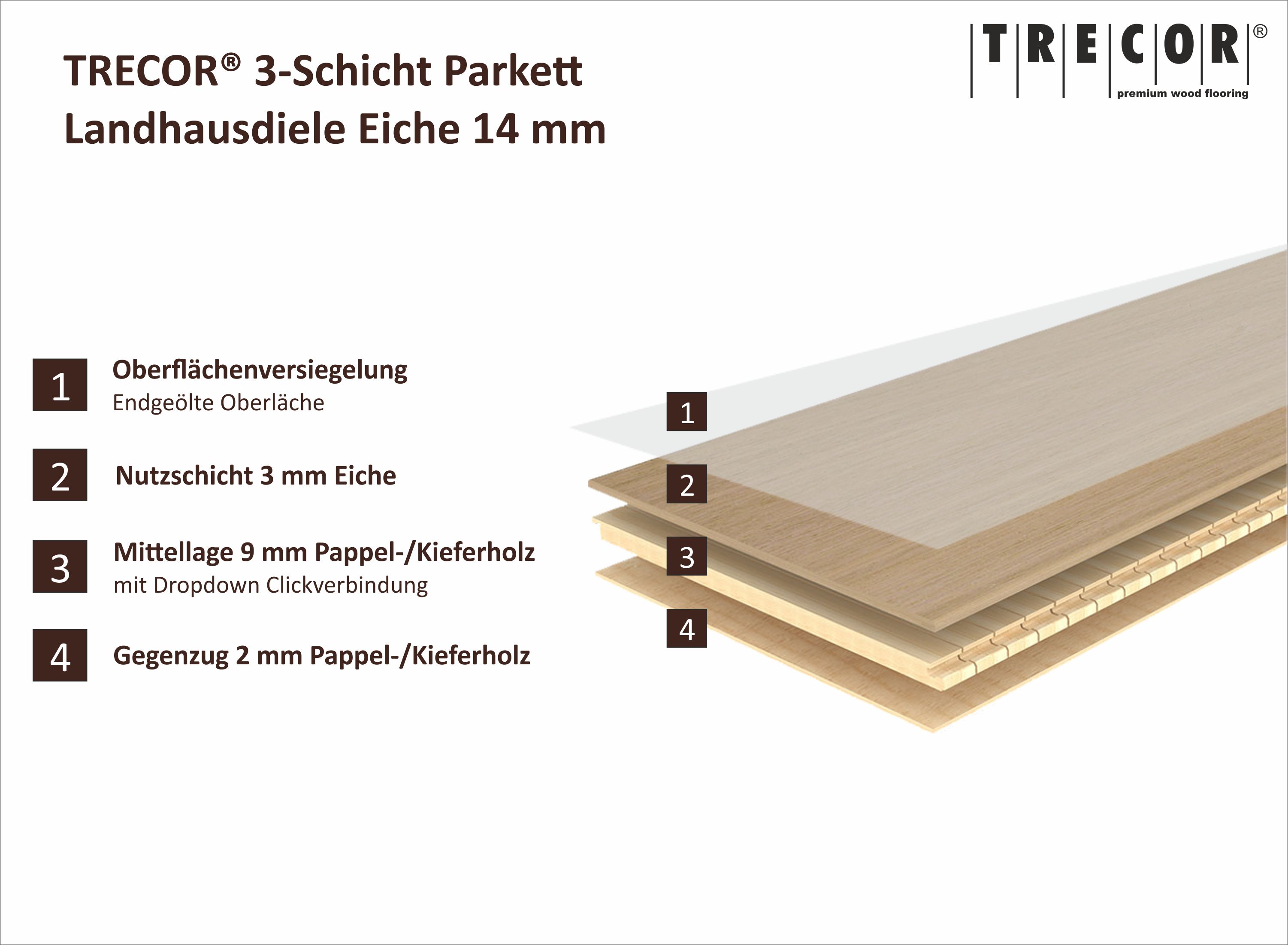 - Aufbau: Decklage/Nutzschicht: 3 mm Eiche | Mittellage: 9 mm Pappel | Gegenzug: 2 mm Kiefer