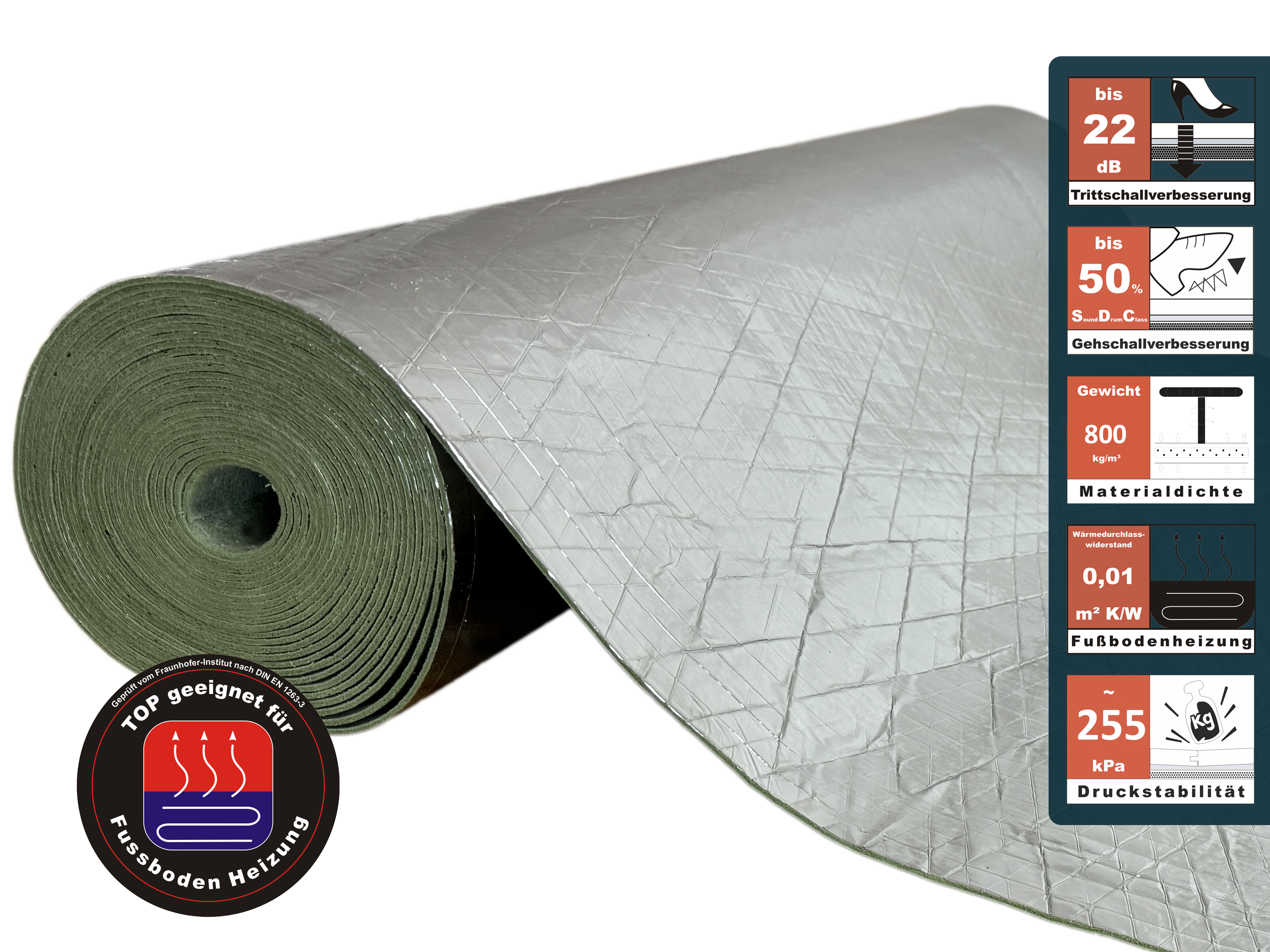 Wichtig ist bei dieser Variante die Verwendung einer Hochwertigen Trittschalldämmung, wie z.B. uficell® topsonic Akustik. Dadurch werden leiche Unebenheiten ausgeglichen, sowie Tritt-/ und Gehschall verbessert.