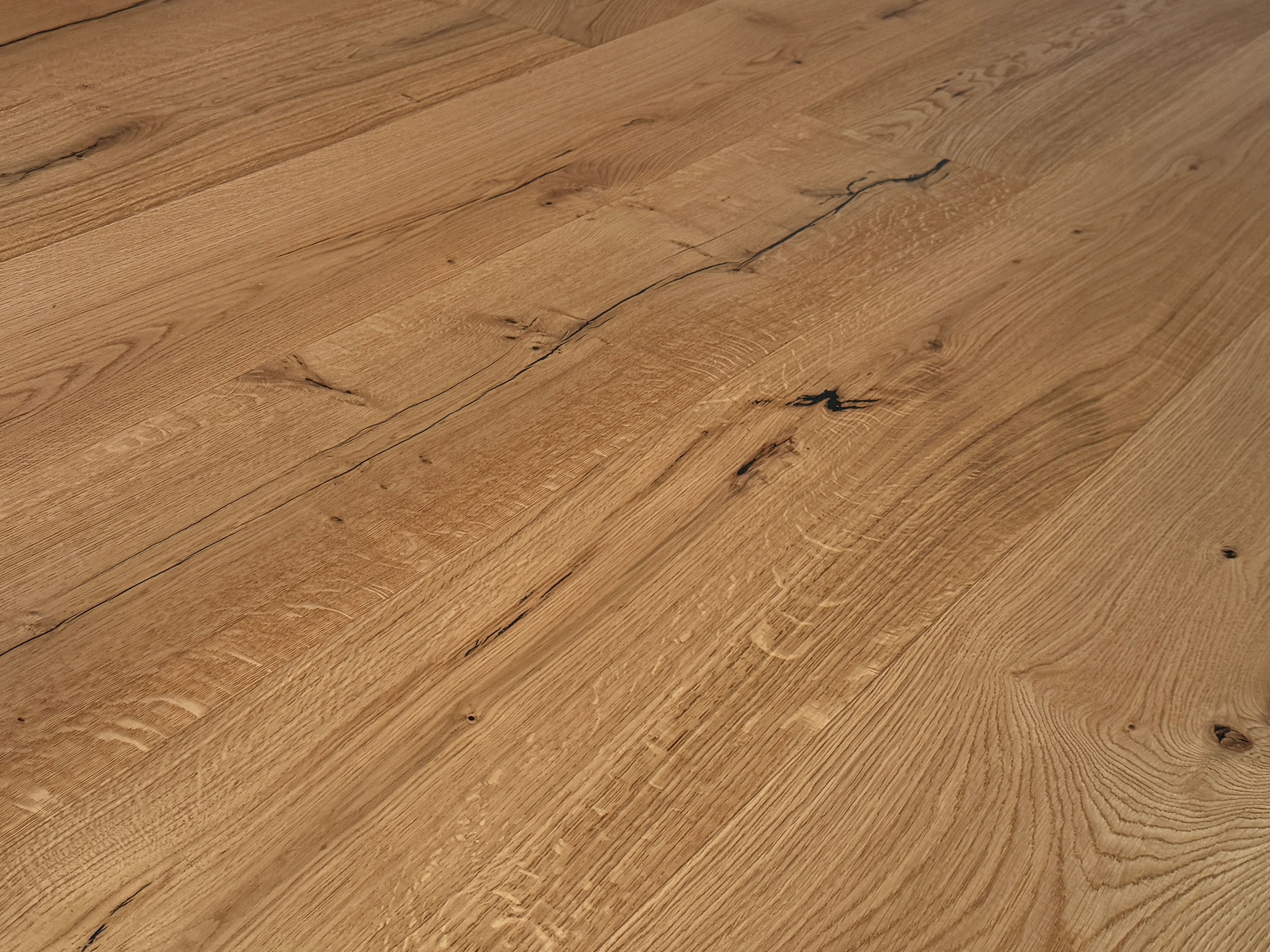 Es handelt sich um eine ruhige Optik. Gesunde Äste ca. 15- 30 mm (kleinster Durchmesser) sind vorhanden. Die Dielen sind im Prinzip frei von Splint. Natürliche Farbunterschiede sind zulässig. Haarrisse sind vereinzelt zulässig. Risse sind keine vorhanden. Der Kurzlängenanteil beträgt ca. 10 %. Astkittungen sind schwarz gespachtelt. Unsere TRECOR® Landhausdiele Eiche Natur wird aus europäischer Eiche gefertigt. Die schöne Färbung der Eiche strahlt Wärme aus und lässt die Räume sehr natürlich und gemütlich wirken.