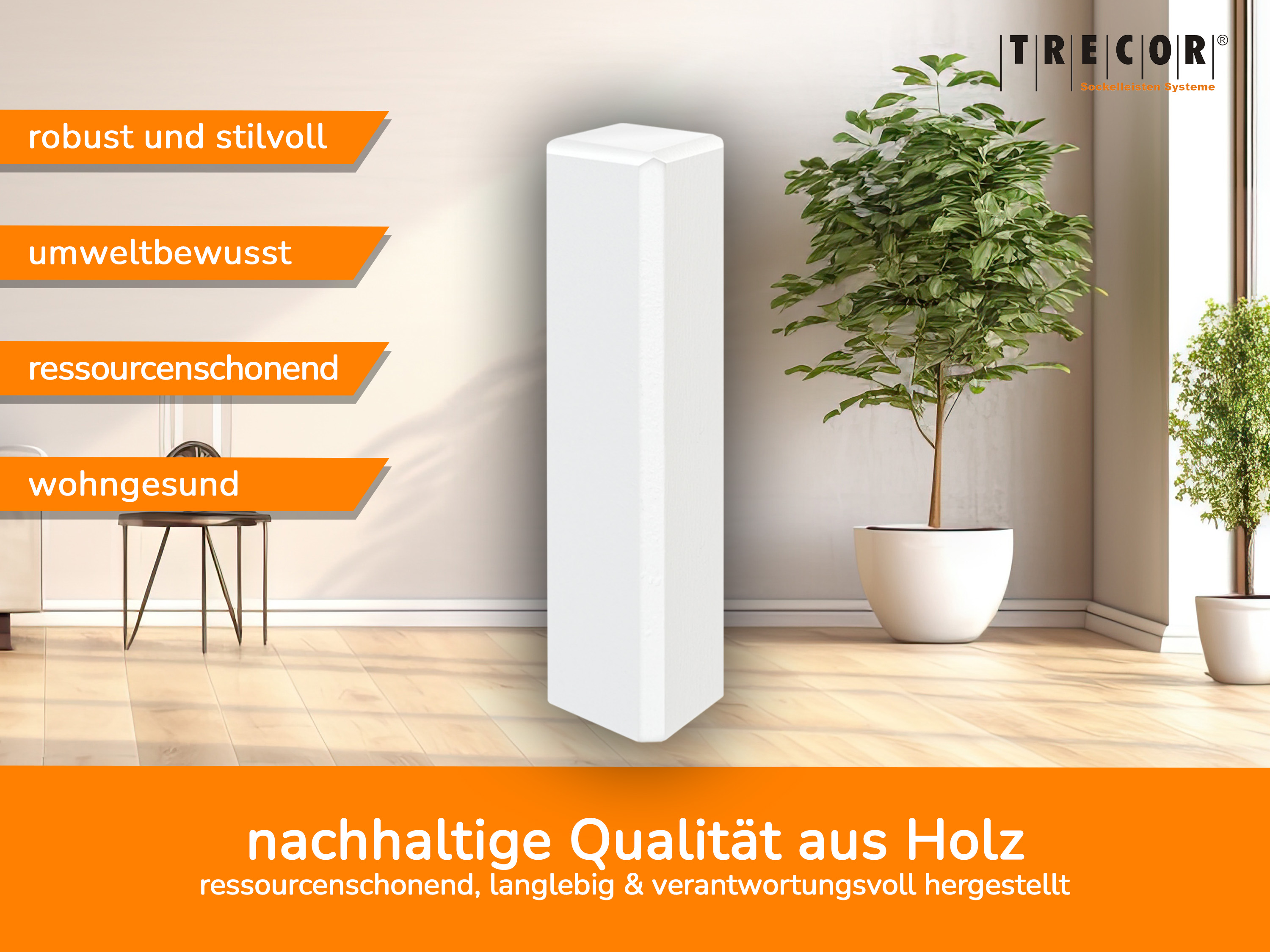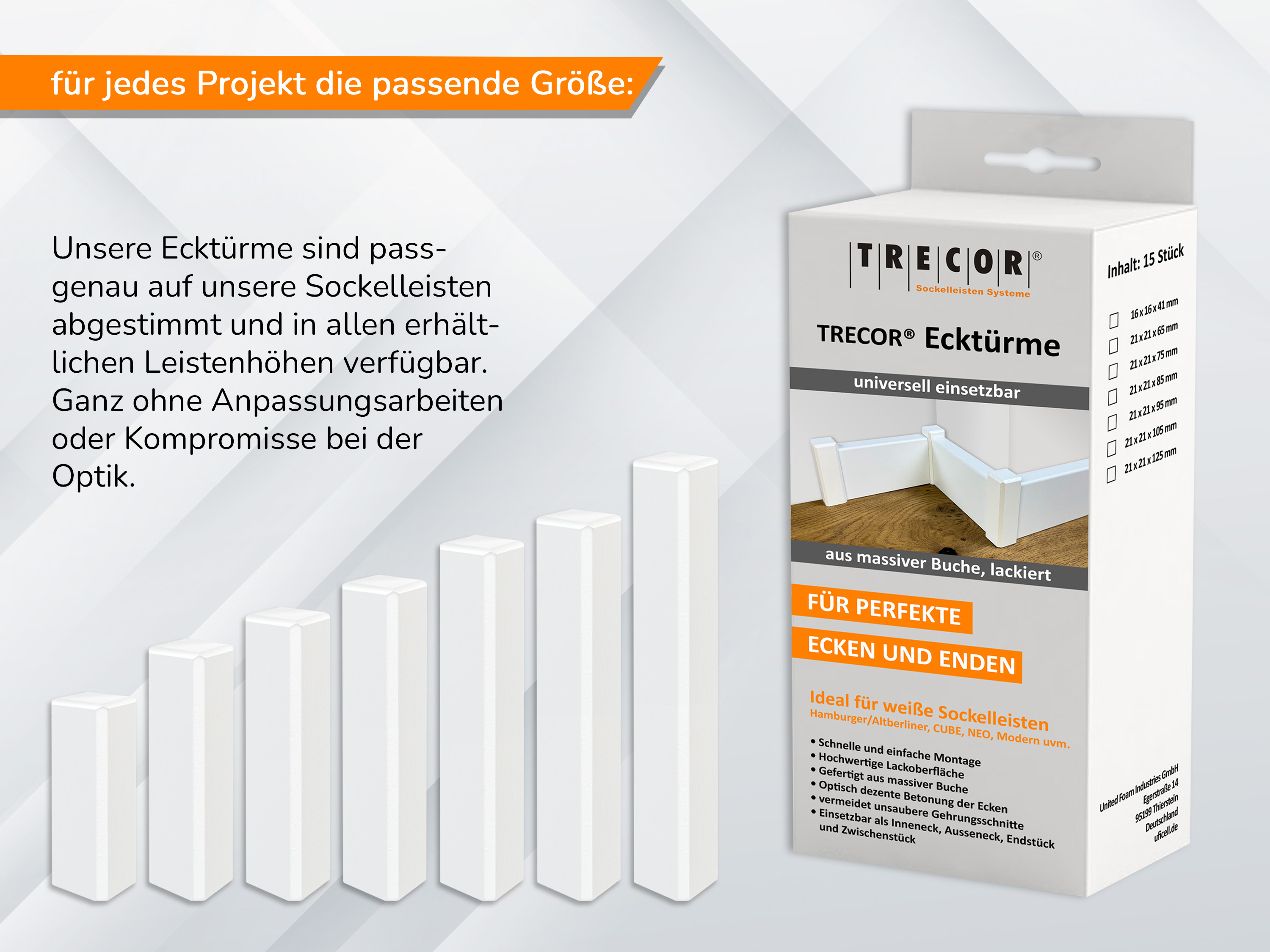 Wegen ihrer zeitlosen Form und Farbe passen die Holzecken in alle Räume und zu allen Farbgestaltungen. Sie können leicht überlackiert und individuellen Farbvorstellungen angepasst werden.