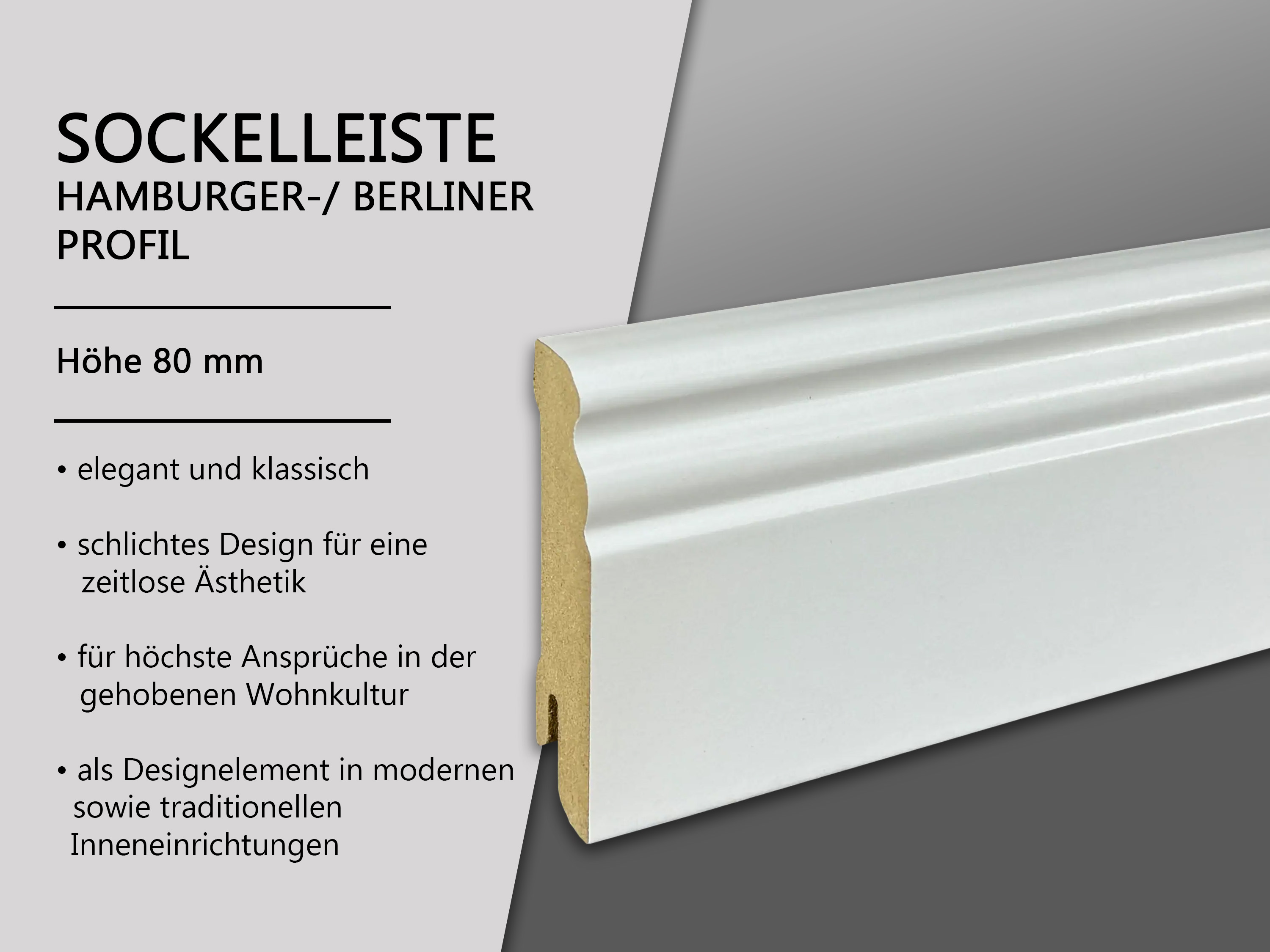 Trecor® Sockelleiste Hamburger-/Berliner Profil, MDF, Altberliner Fußleiste weiß