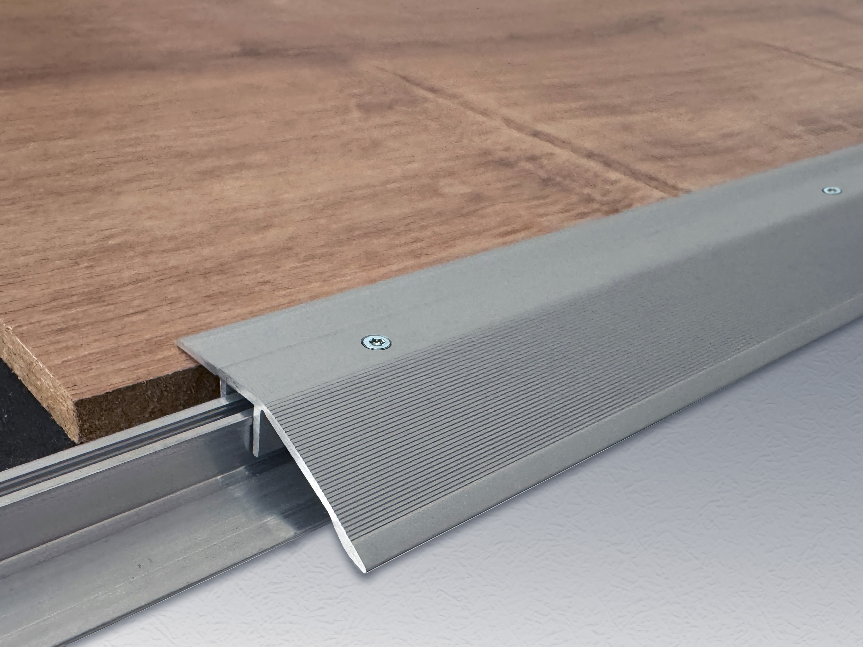 Äußerst stabiles Übergangsprofil für große Flächen, die durch eine Dehnungsfuge geteilt werden müssen oder für Türdurchgänge mit einer Belagshöhe von 7-16 mm. Durch die schmale Sichtbreite von nur 33 mm verschwindet das Profil bei geschlossenem Zustand der Tür unsichtbar darunter. Die spezielle Konstruktion (automatische Höheneinstellung) ermöglicht auch den Einsatz mit geringen Höhenunterschieden. Für etwas breitere Dehnungsfugen wurde die Serie mit einem 45 mm und 60 mm breiten Übergangsprofil Profil ergänzt.