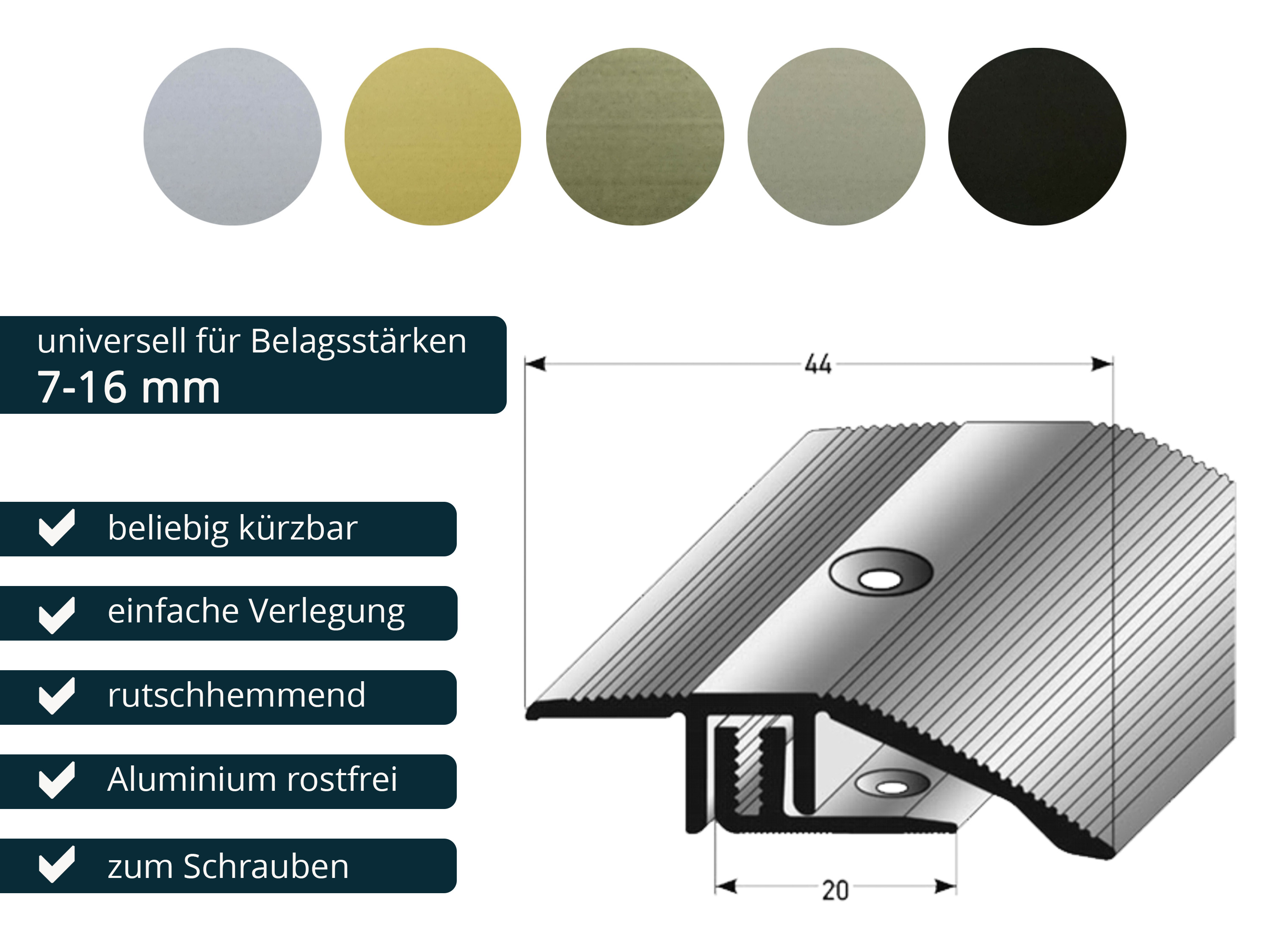 Äußerst stabiler Höhenausgleich für den Übergang von Laminat- oder Parkettböden zu Teppichböden o. Ä., Sichtbreite 44 mm. Durch die spezielle Konstruktion (automatische, stufenlose Höheneinstellung) für Böden mit Höhenunterschieden von 7-16 mm mit nur einem Profil einsetzbar.