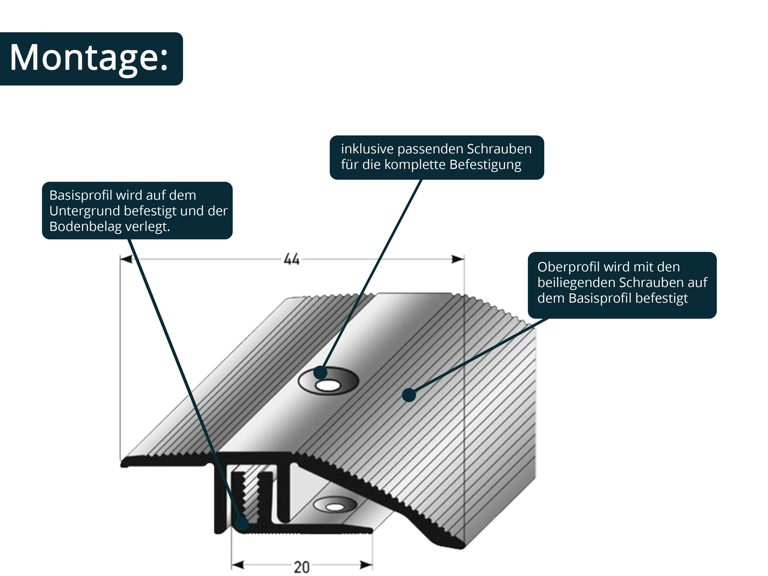 Äußerst stabiles 2-teiliges Abschlussprofil für den Abschluss von Laminat- oder Parkettböden an der Wand, Terrassentüren oder Türschwellen, Sichtbreite 21 mm. Durch die spezielle Konstruktion (automatische, stufenlose Höheneinstellung) für Böden mit einer Belagshöhe von 7-16 mm einsetzbar. Anwendung: Als erstes wird das Basisprofil auf dem Untergrund verschraubt bzw. bei Einsatz einer Warmwasser Fußbodenheizung nach erfolgter Grundierung auf dem Estrich mit Soudal High Tack Montagekleber verklebt. Nach erfolgter Verlegung des Fußbodens wird das Oberprofil auf das Basisprofil aufgelegt. Die beiden Stege greifen über den Schraubkanal des Basisprofils. Mit den beigefügten Schrauben wird es im Schraubkanal befestigt. TIPP: Es ist ratsam sich vom Oberteil des Profils ein kurzes Musterstück (etwa 2 cm) zum Verlegen abzuschneiden. Dadurch wird sichergestellt das die verlegenden Fußboden Dielen optimal zum Basisprofil (Abstand ca. 5-8 mm / Dehnungsfuge) und nicht zu kurz (Abdeckung Oberteil) geschnitten werden.