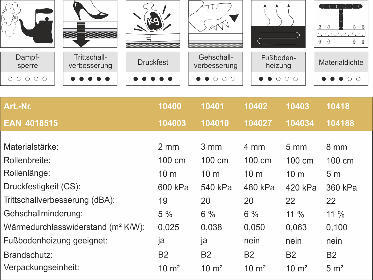 Wenn höchste Anforderungen an Qualität, Trittschalldämmung, Raumkomfort und Belastungsfähigkeit gestellt werden. Die ideale Dämmunterlage unter hochwertigen Hartbodenbelägen (z.B. Parkett-/ Laminatboden). Besitzt überragende materialtechnische Eigenschaften, wie sie etwa im Objektbereich gefordert werden. Durch Gummibeimischung hervorragend für die verklebte Anwendung einsetzbar. Auch für Auslegware geeignet (z.B. Teppich- und Vinylböden) sowie als Vibrationsmatte unter Waschmaschinen und Trockner.