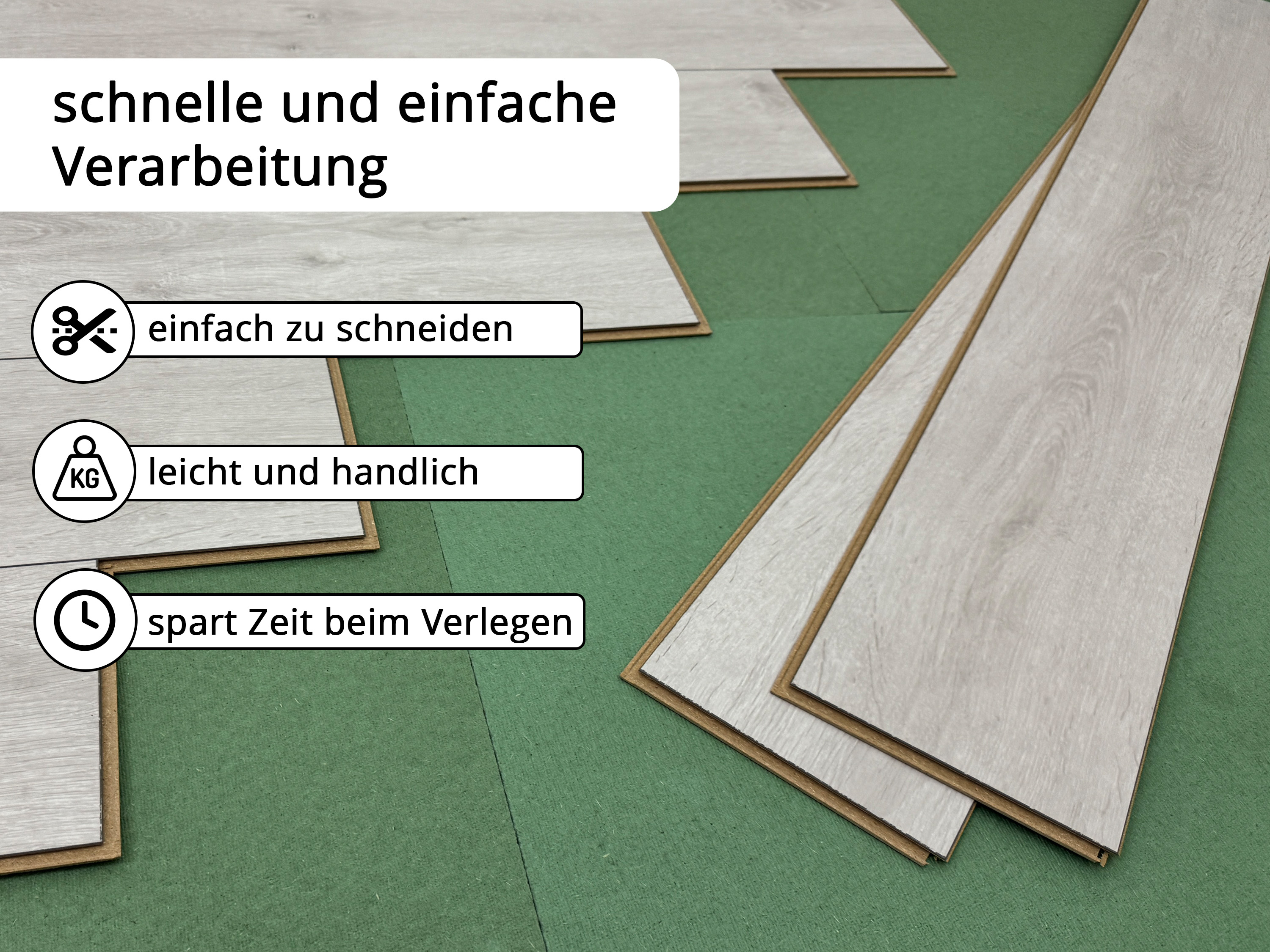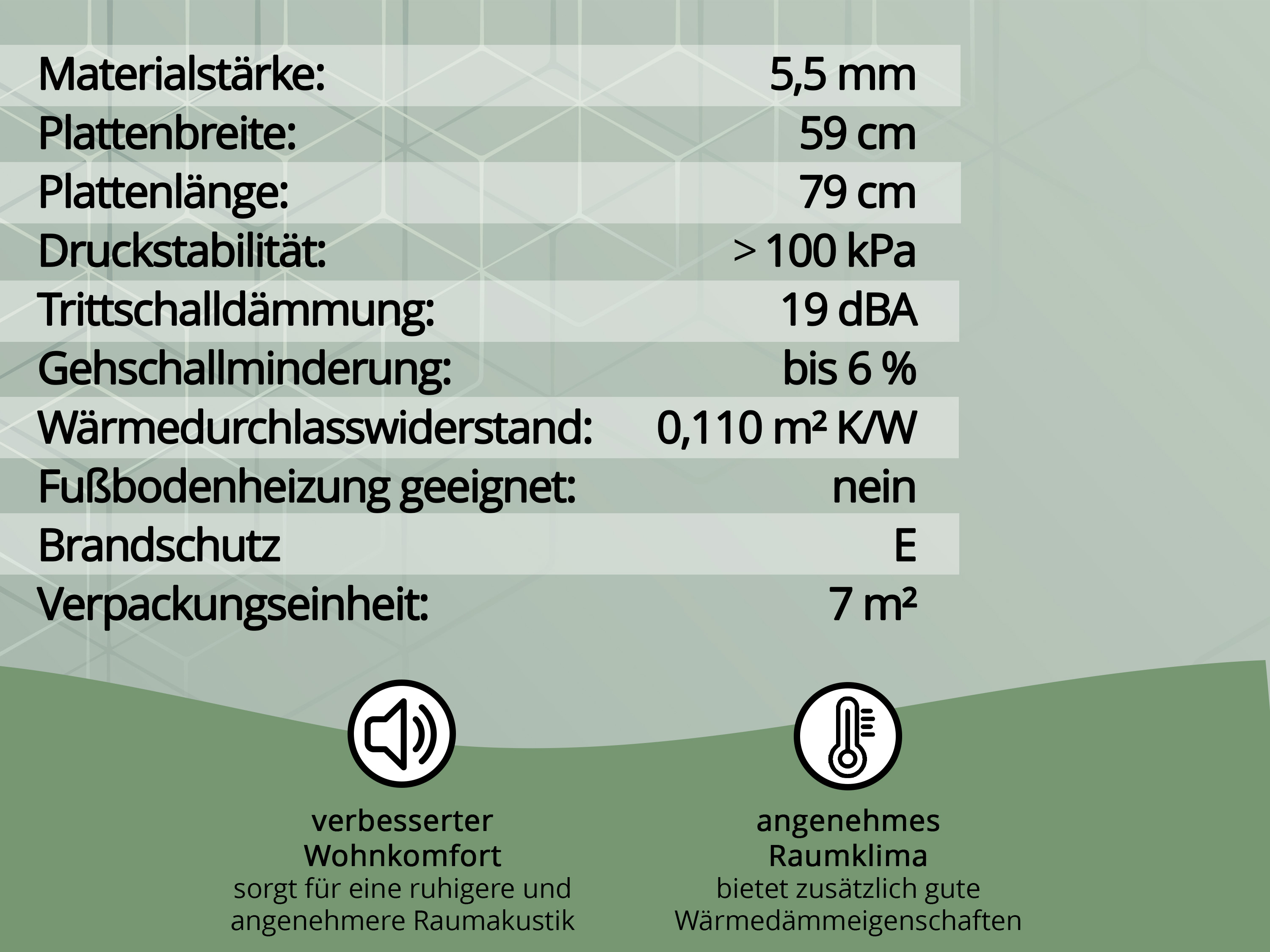 Belastbares, druckstabiles Naturmaterial ohne schädliche Beimischungen. Umweltfreundlich und kompostierbar. Gleicht Unebenheiten bis 3 mm aus. Einfach zu verlegen, hohe Kälte/Wärme Isolationsfähigkeiten. Trittschalldämmung je nach Fußbodenkonstruktion bis zu 26 dB (A). Druckstabil bis 20 to/m².