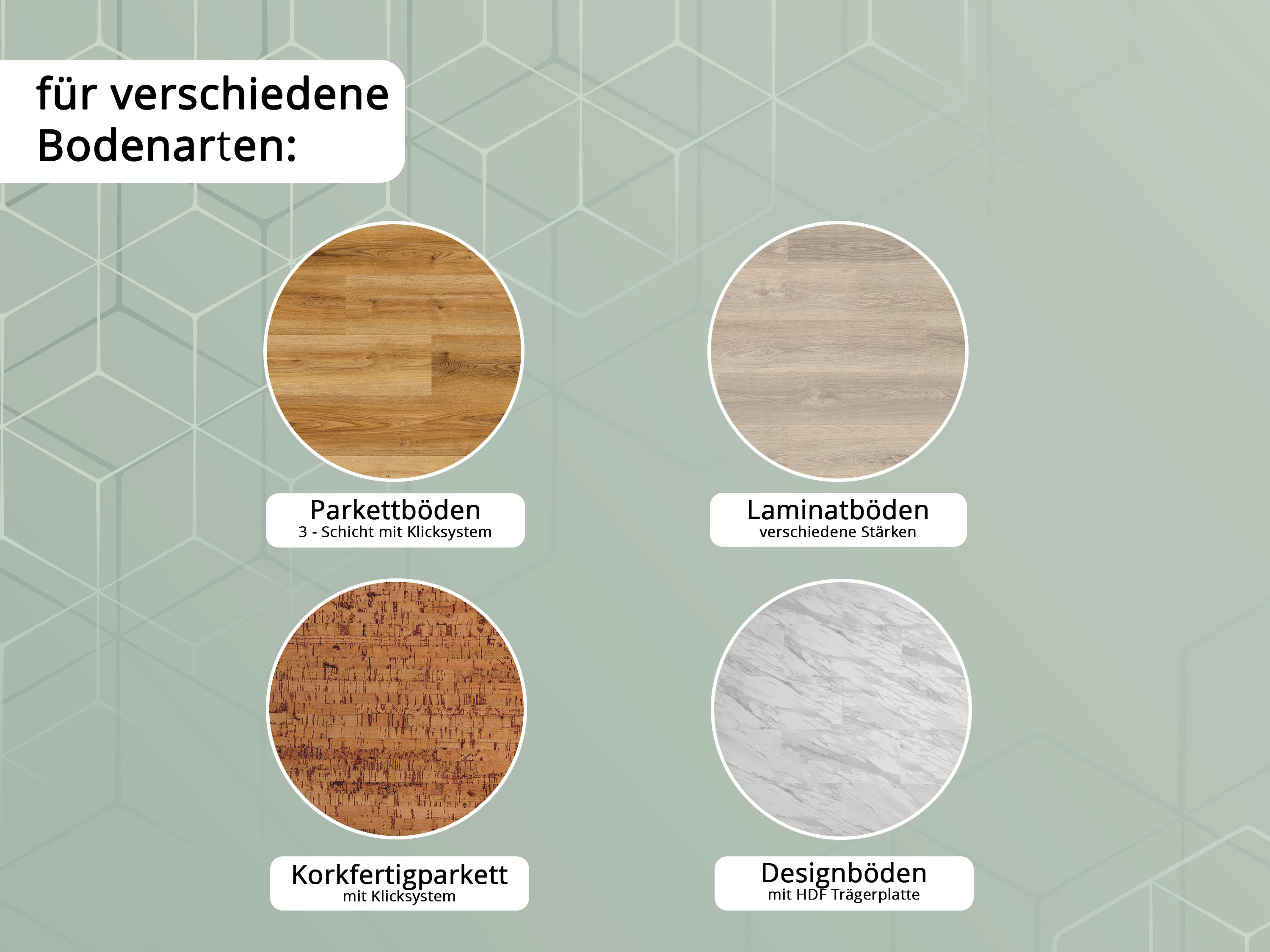 Vor dem Verlegen ist sicherzustellen, dass der Estrich oder Unterboden nach DIN 18365 eben, sauber, trocken, rissfrei, zug- und druckfest ist. Bei erhöhter Bau- bzw. Restfeuchte und generell bei allen mineralischen Unterböden (z.B. Estrich) wird die Verwendung einer mind. 0,2 mm starken PE-Folie (als Zubehör erhältlich) empfohlen. Die Parquet-Felt Platten sind auf ebenen und trockenen Untergrund zu verlegen. Die einzelnen Platten werden stumpf aneinander gestoßen. Die Stöße können anschließend mit einem Klebeband fixiert werden. Dadurch wird beim Verlegen des Oberbodens ein verschieben der einzelnen Platten verhindert. Das Zuschneiden der Platten in den Ecken und Wandbereichen erfolgt mit einer Schere oder einem Teppichmesser. Danach kann mit der schwimmenden Verlegung des Oberbodens begonnen werden.