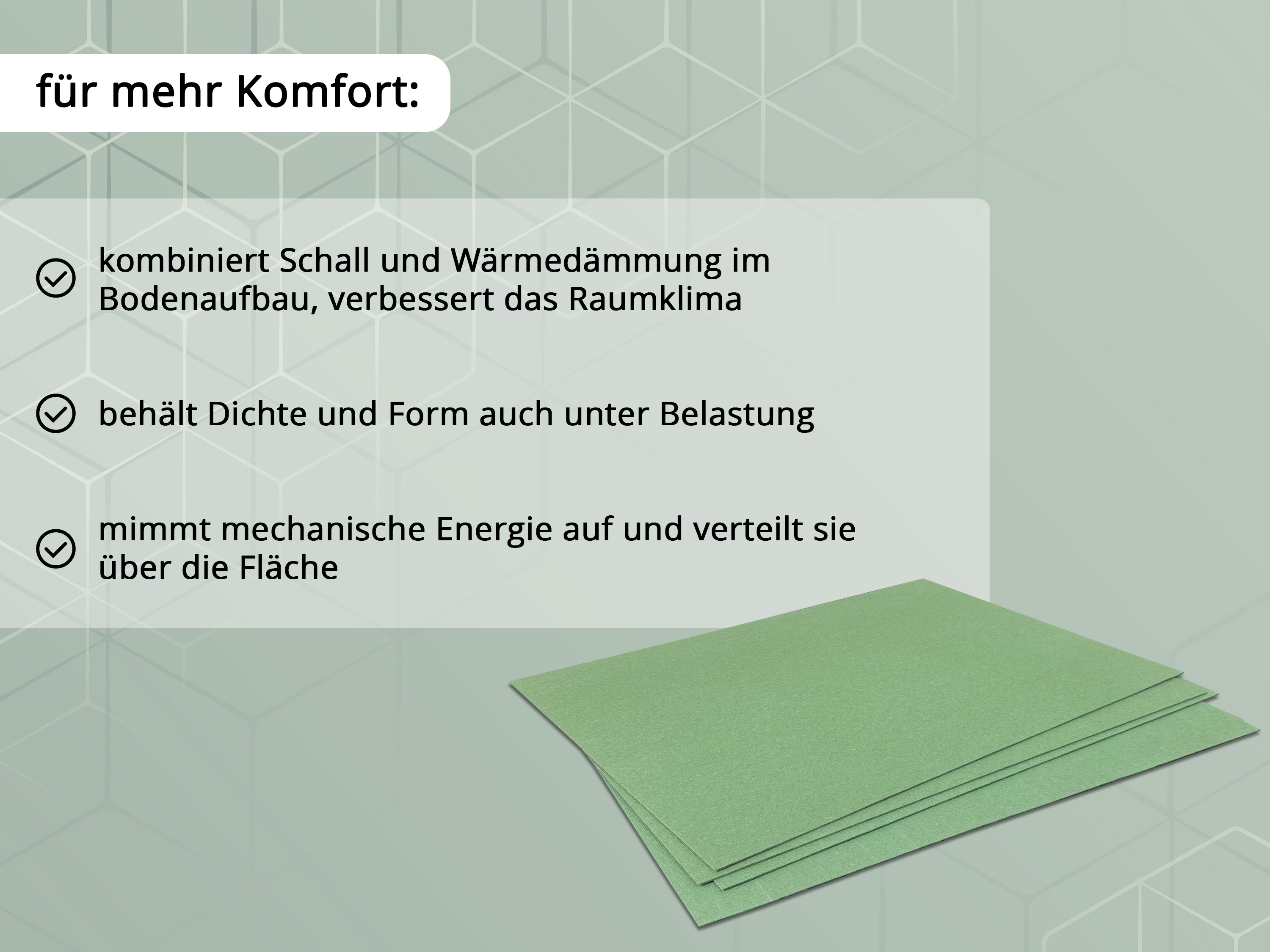 Belastungsfähige, druckstabile Unterlage für alle schwimmend verlegten Holzfertigböden. Erfüllt hohe ökologische Anforderungen. Hervorragend geeignet, wenn eine hohe Kälte-Isolationswirkung gewünscht ist. Auf Grund der sehr guten Wärmedämmeigenschaften NICHT für Fußbodenheizung geeignet.