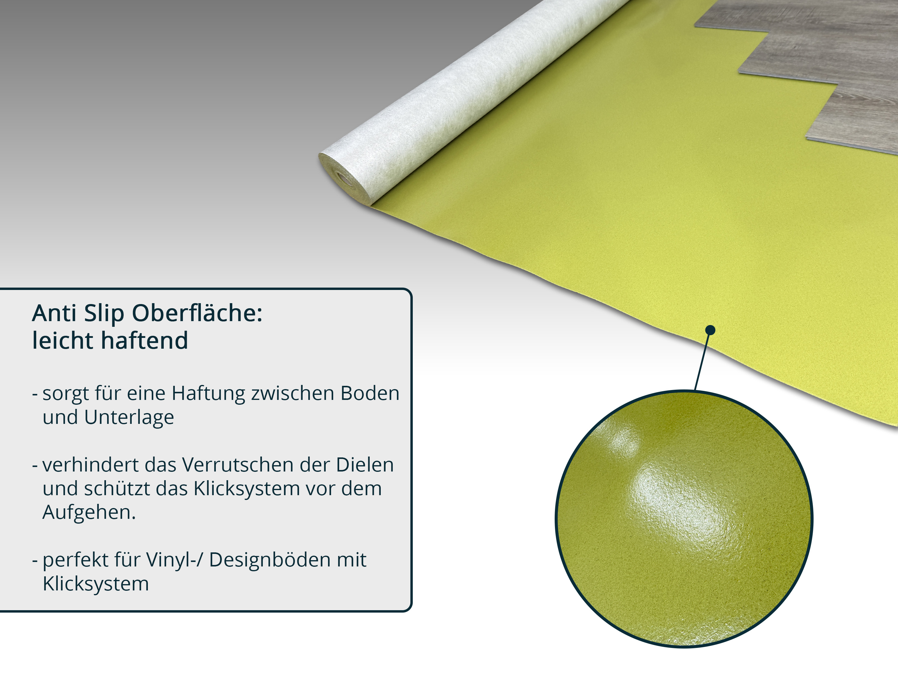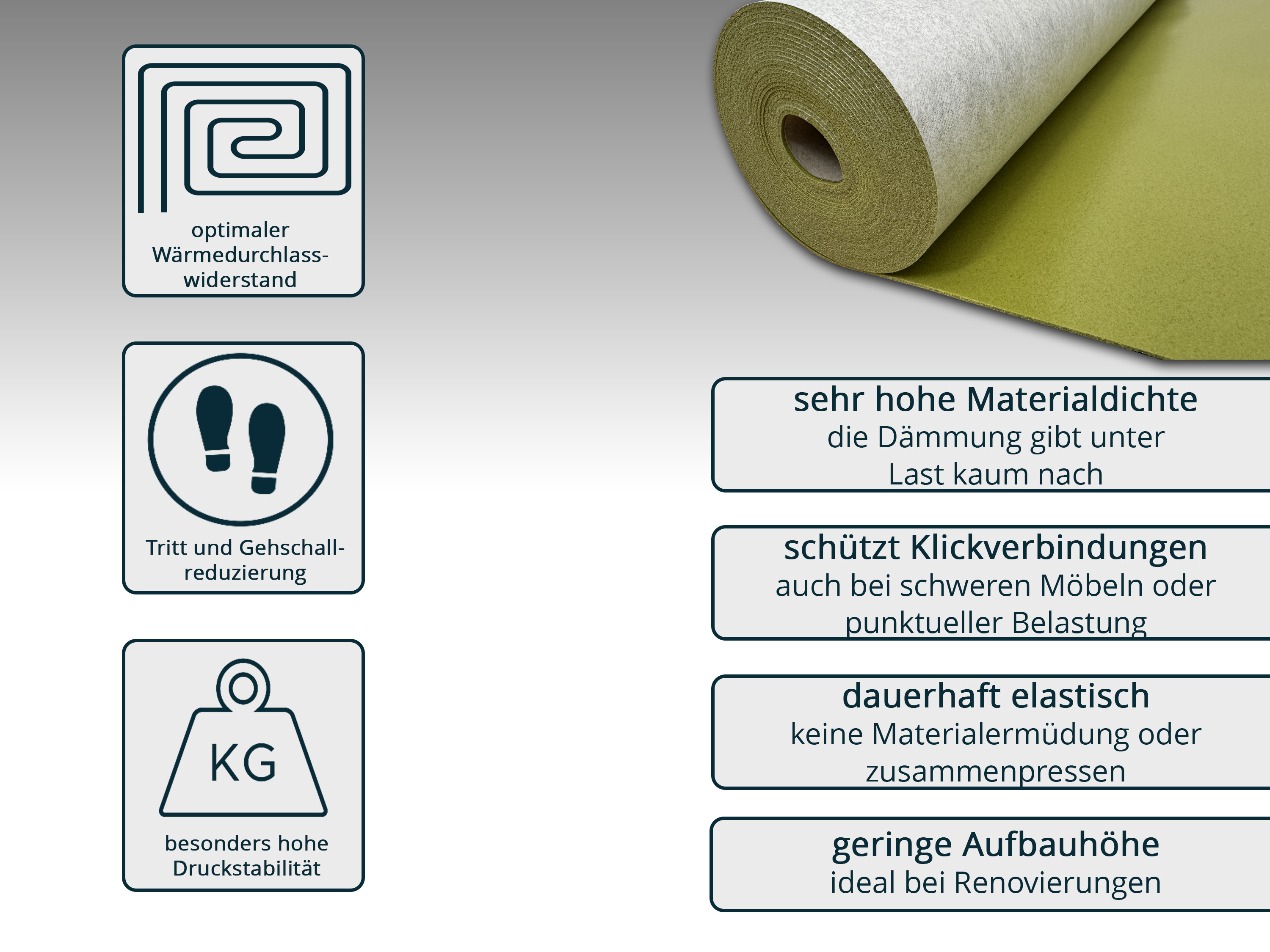 Wenn höchste Anforderungen an Qualität, Geh-/ Trittschalldämmung, Raumkomfort und Belastungsfähigkeit gestellt werden. Die ideale Dämmunterlage unter 3 - 5 mm starken RIGID / SPC Vinyl-Designböden mit „Klick-Verbindung“ oder hochwertigen Hartbodenbelägen (z. B. Parkett-/ Laminatböden). Besitzt überragende materialtechnische Eigenschaften, wie sie etwa im Objektbereich gefordert werden.