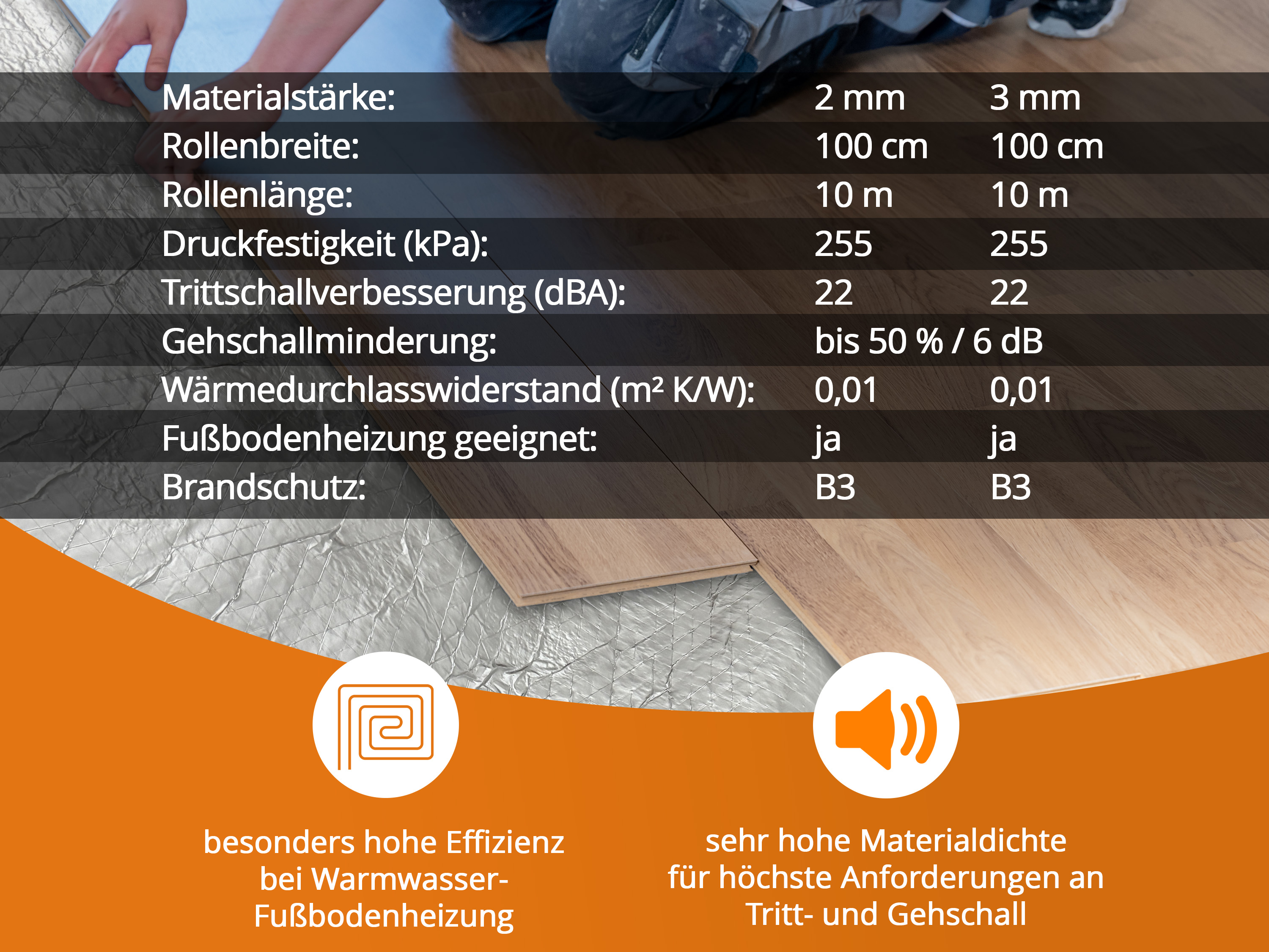 Wenn höchste Anforderungen an Qualität, Geh-/ Trittschalldämmung, Raumkomfort und Belastungsfähigkeit gestellt werden. Die ideale Dämmunterlage unter hochwertigen schwimmend verlegten Hartbodenbelägen mit Fußbodenheizung (z.B. Parkett-/ Laminatboden). Besitzt überragende materialtechnische Eigenschaften, wie sie etwa im Objektbereich gefordert werden. Höchste Effizienz bei Warmwasser Fußbodenheizung - nur 0,01 m² k/W Wärmedurchlasswiderstand.