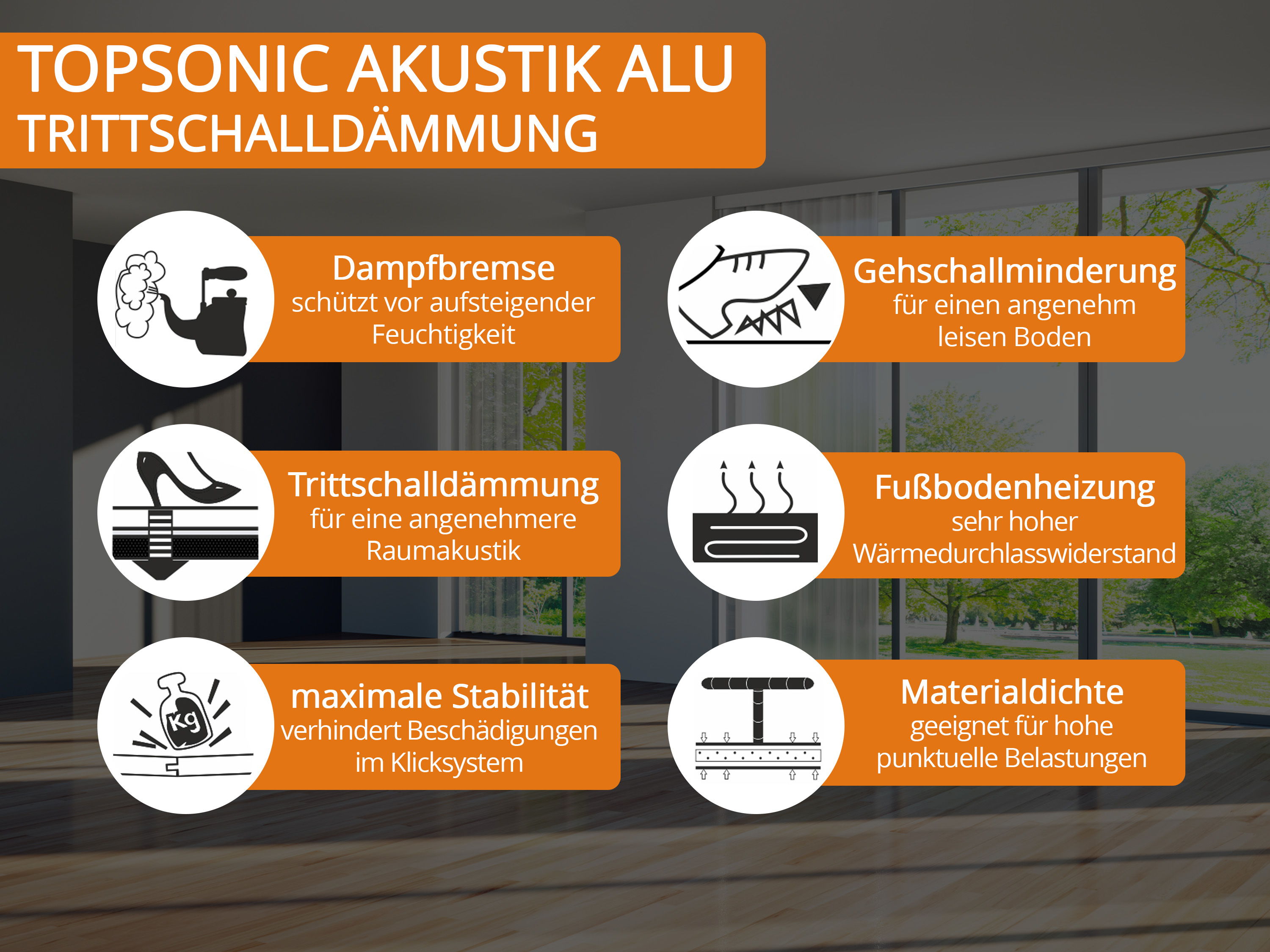 Trittschalldämmung bis 22 dB(A) und Gehschallminderung bis 50 %, beste Akustikwerte, TOP bei Fußbodenheizung