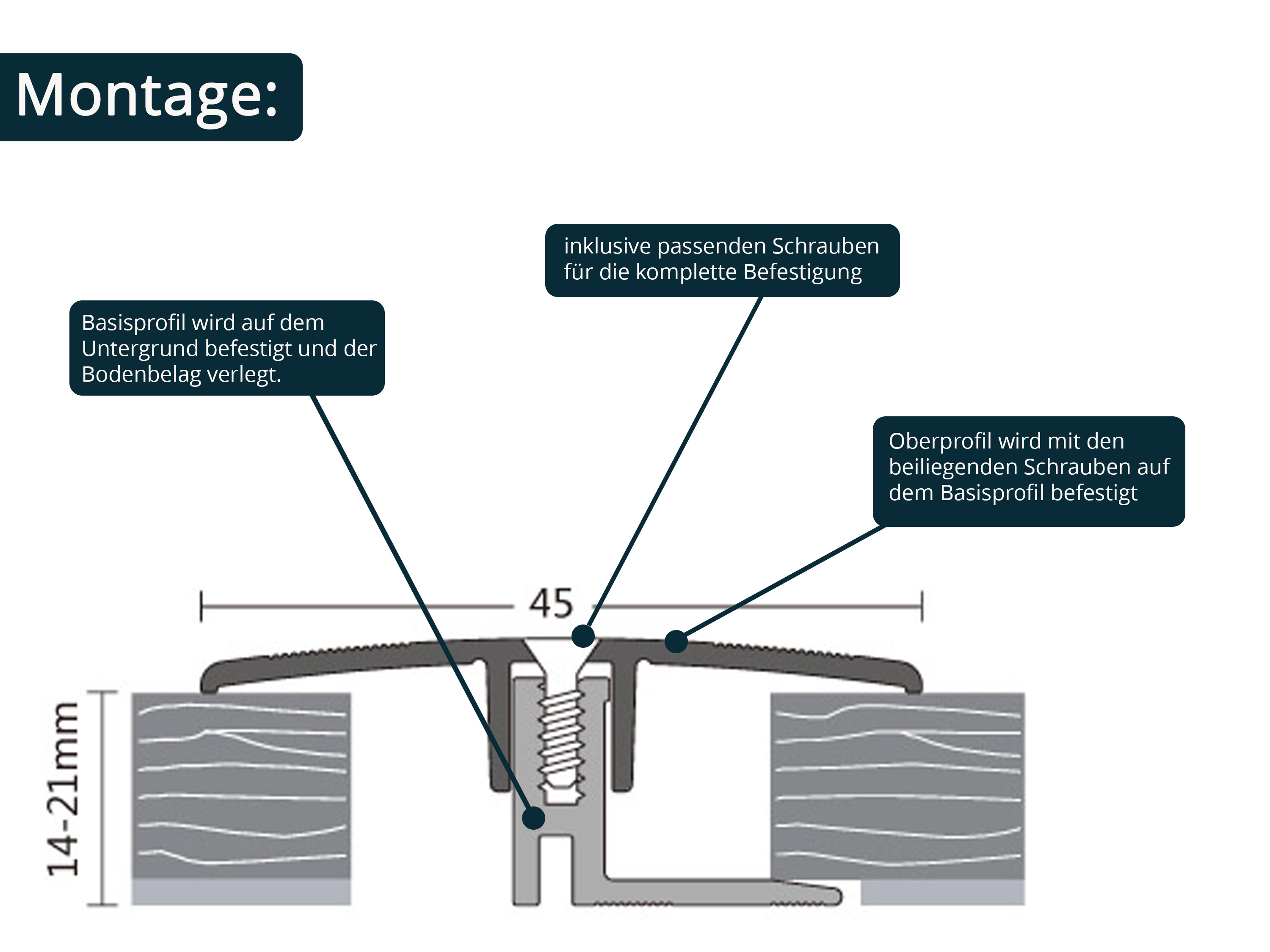 Äußerst stabiles 2-teiliges Abschlussprofil für den Abschluss von Laminat- oder Parkettböden an der Wand, Terrassentüren oder Türschwellen, Sichtbreite 21 mm. Durch die spezielle Konstruktion (automatische, stufenlose Höheneinstellung) für Böden mit einer Belagshöhe von 14-21 mm einsetzbar. Anwendung: Als erstes wird das Basisprofil auf dem Untergrund verschraubt bzw. bei Einsatz einer Warmwasser Fußbodenheizung nach erfolgter Grundierung auf dem Estrich mit Soudal High Tack Montagekleber verklebt. Nach erfolgter Verlegung des Fußbodens wird das Oberprofil auf das Basisprofil aufgelegt. Die beiden Stege greifen über den Schraubkanal des Basisprofils. Mit den beigefügten Schrauben wird es im Schraubkanal befestigt. TIPP: Es ist ratsam sich vom Oberteil des Profils ein kurzes Musterstück (etwa 2 cm) zum Verlegen abzuschneiden. Dadurch wird sichergestellt das die verlegenden Fußboden Dielen optimal zum Basisprofil (Abstand ca. 5-8 mm / Dehnungsfuge) und nicht zu kurz (Abdeckung Oberteil) geschnitten werden.