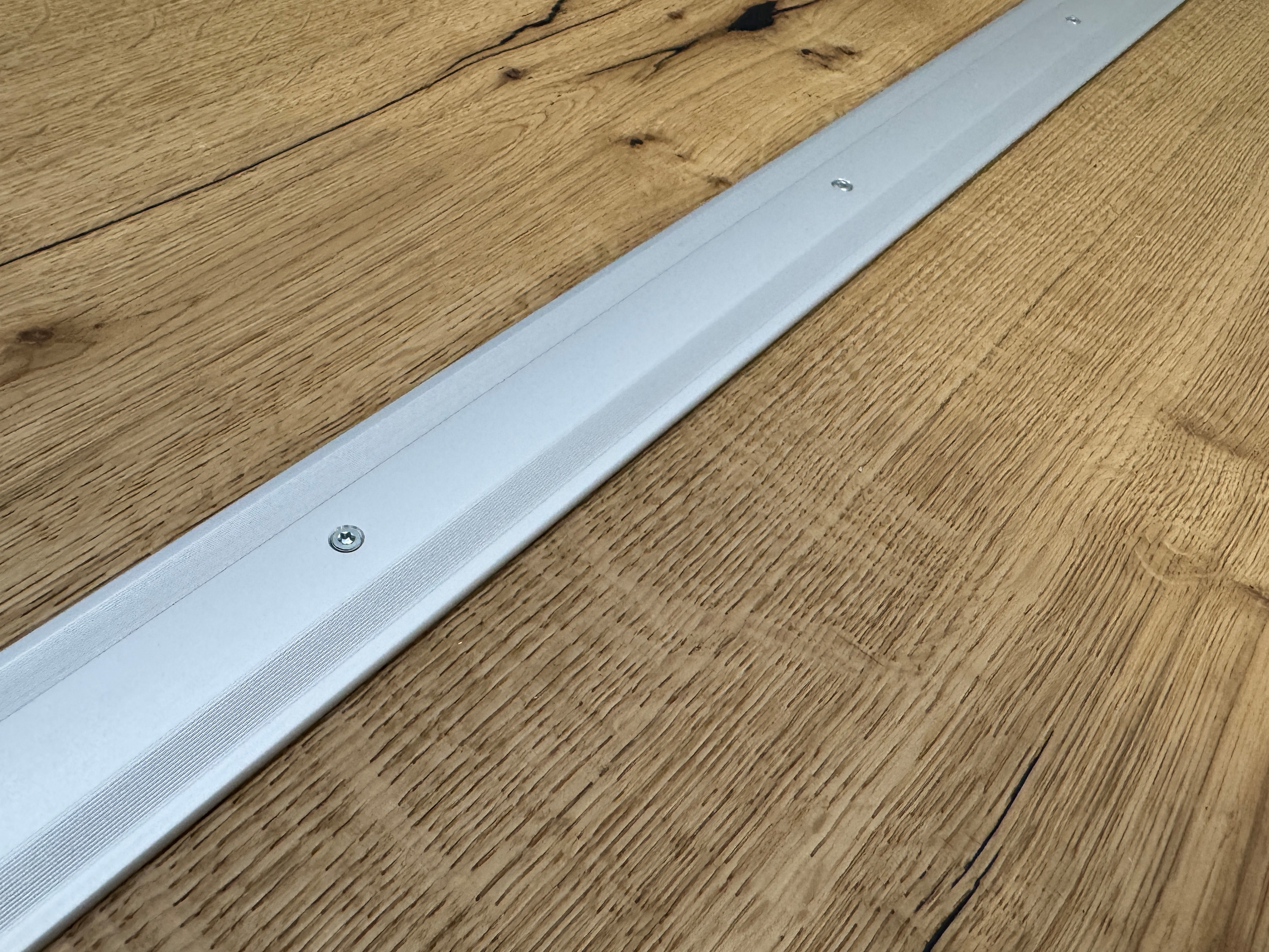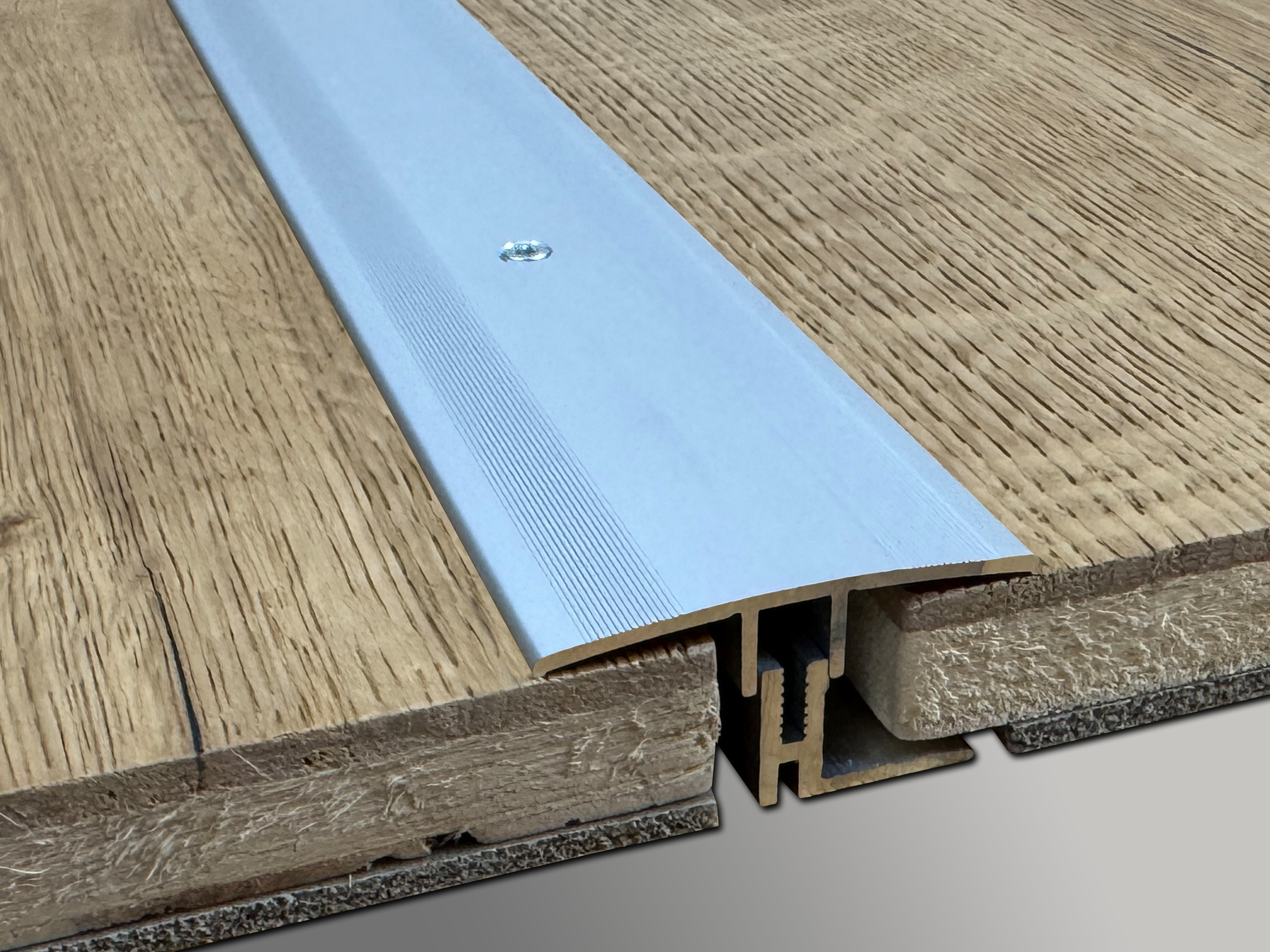Äußerst stabiles Übergangsprofil für große Flächen, die durch eine Dehnungsfuge geteilt werden müssen oder für Türdurchgänge mit einer Belagshöhe von 14-21 mm. Durch die schmale Sichtbreite von nur 33 mm verschwindet das Profil bei geschlossenem Zustand der Tür unsichtbar darunter. Die spezielle Konstruktion (automatische Höheneinstellung) ermöglicht auch den Einsatz mit geringen Höhenunterschieden. Für etwas breitere Dehnungsfugen wurde die Serie mit einem 45 mm und 60 mm breiten Übergangsprofil Profil ergänzt.