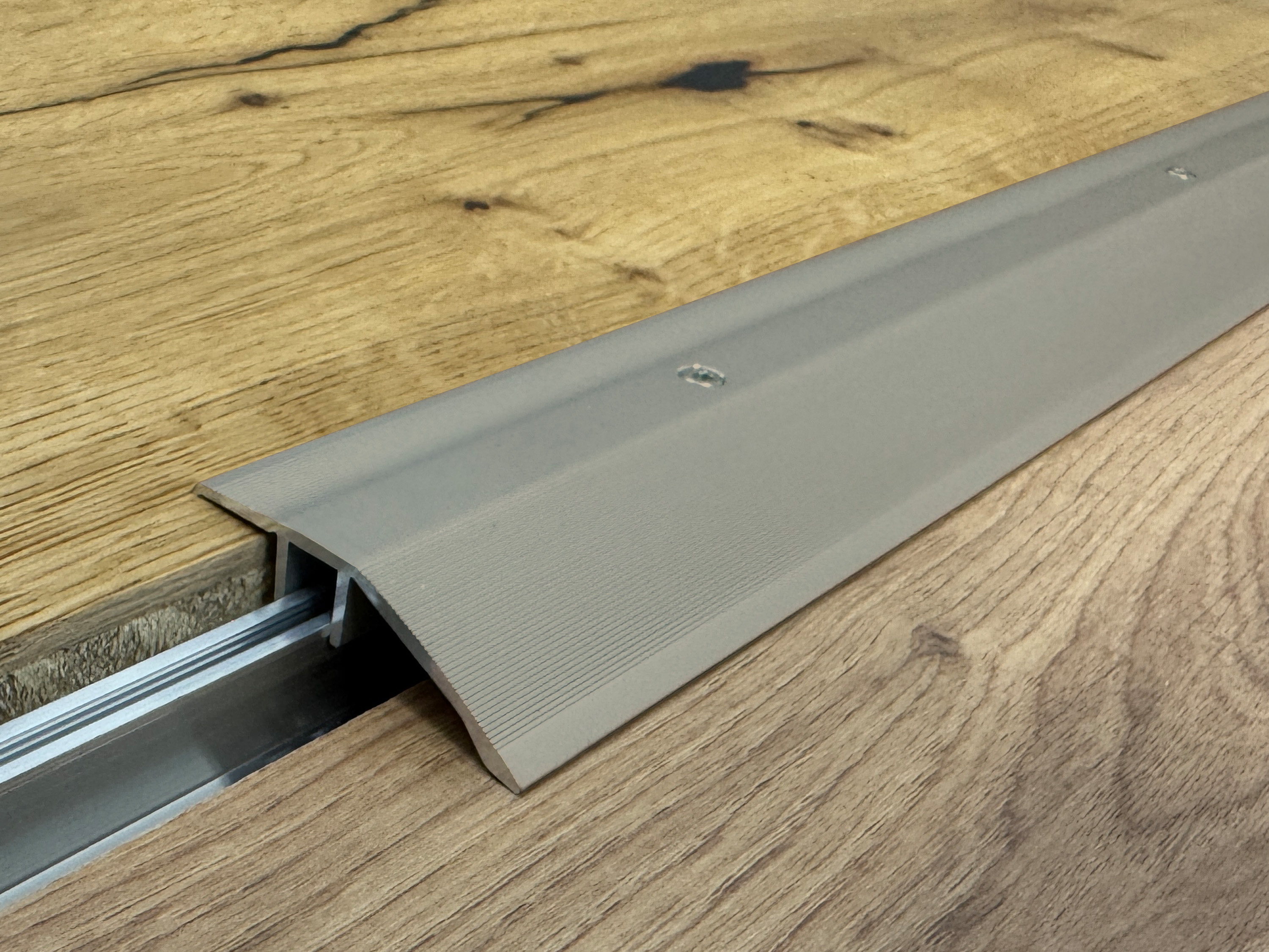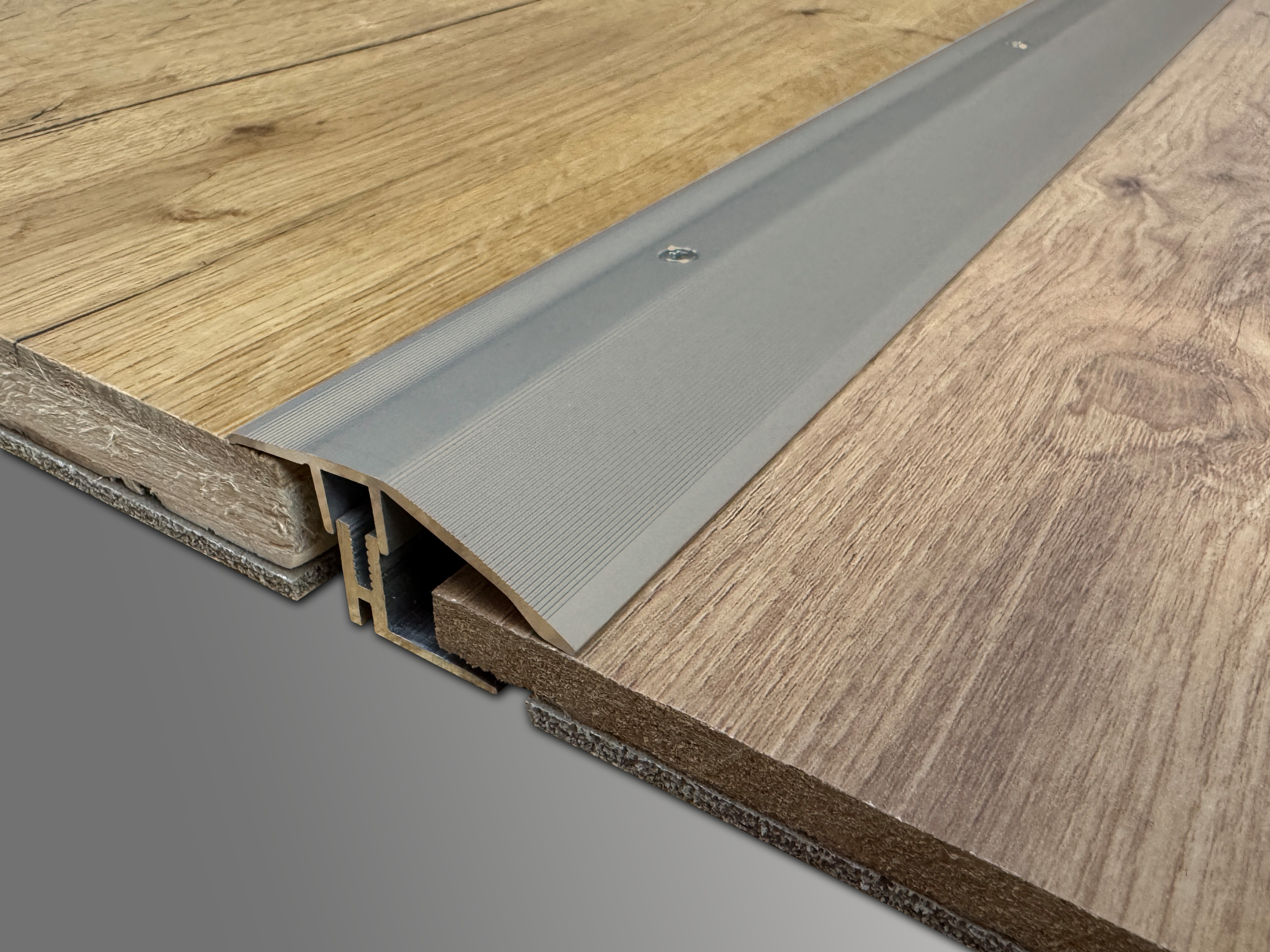 Äußerst stabiles Übergangsprofil für große Flächen, die durch eine Dehnungsfuge geteilt werden müssen oder für Türdurchgänge mit einer Belagshöhe von 14-21 mm. Durch die schmale Sichtbreite von nur 33 mm verschwindet das Profil bei geschlossenem Zustand der Tür unsichtbar darunter. Die spezielle Konstruktion (automatische Höheneinstellung) ermöglicht auch den Einsatz mit geringen Höhenunterschieden. Für etwas breitere Dehnungsfugen wurde die Serie mit einem 45 mm und 60 mm breiten Übergangsprofil Profil ergänzt.