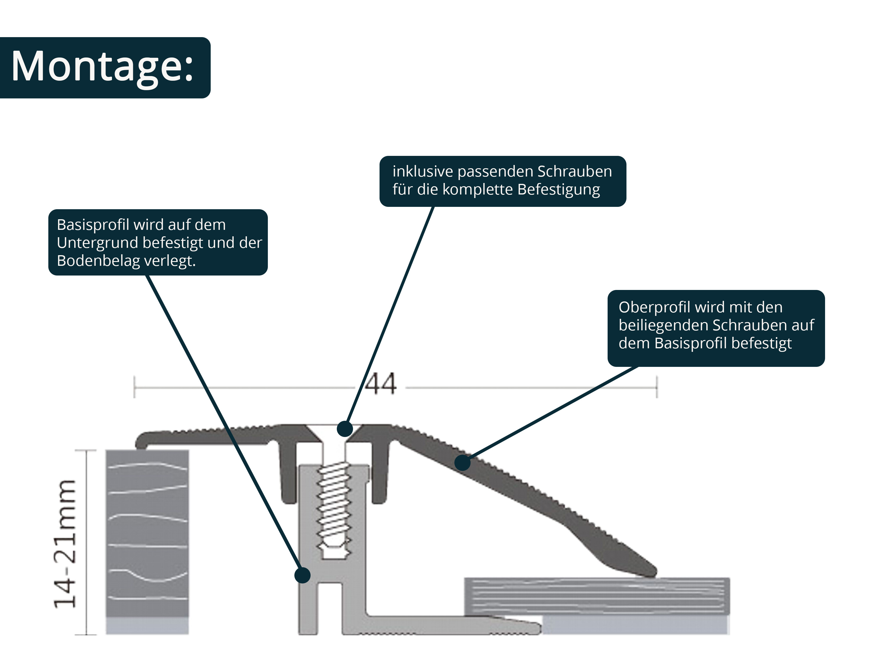 Äußerst stabiles 2-teiliges Abschlussprofil für den Abschluss von Laminat- oder Parkettböden an der Wand, Terrassentüren oder Türschwellen, Sichtbreite 21 mm. Durch die spezielle Konstruktion (automatische, stufenlose Höheneinstellung) für Böden mit einer Belagshöhe von 14-21 mm einsetzbar. Anwendung: Als erstes wird das Basisprofil auf dem Untergrund verschraubt bzw. bei Einsatz einer Warmwasser Fußbodenheizung nach erfolgter Grundierung auf dem Estrich mit Soudal High Tack Montagekleber verklebt. Nach erfolgter Verlegung des Fußbodens wird das Oberprofil auf das Basisprofil aufgelegt. Die beiden Stege greifen über den Schraubkanal des Basisprofils. Mit den beigefügten Schrauben wird es im Schraubkanal befestigt. TIPP: Es ist ratsam sich vom Oberteil des Profils ein kurzes Musterstück (etwa 2 cm) zum Verlegen abzuschneiden. Dadurch wird sichergestellt das die verlegenden Fußboden Dielen optimal zum Basisprofil (Abstand ca. 5-8 mm / Dehnungsfuge) und nicht zu kurz (Abdeckung Oberteil) geschnitten werden.