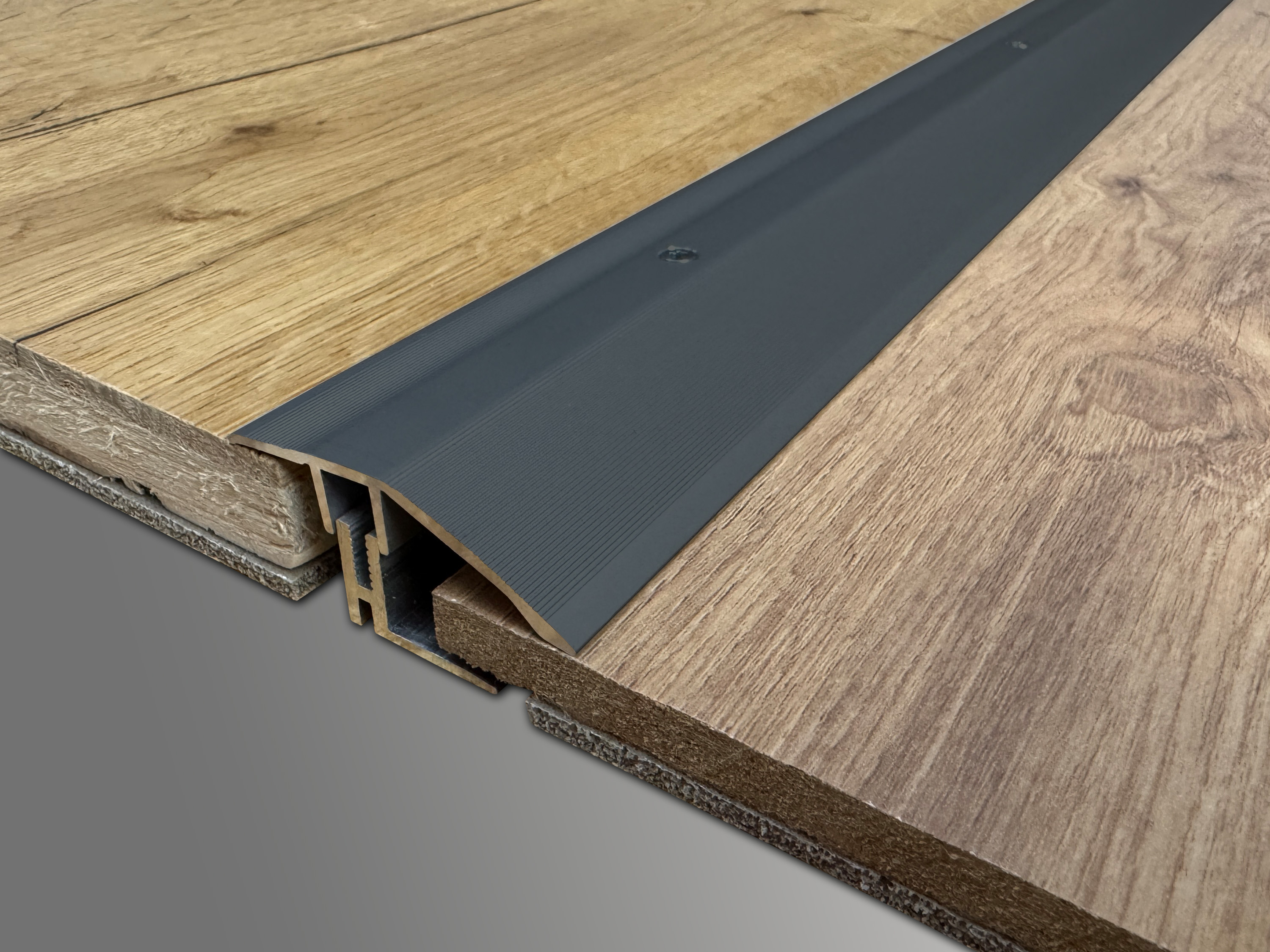 Äußerst stabiles Übergangsprofil für große Flächen, die durch eine Dehnungsfuge geteilt werden müssen oder für Türdurchgänge mit einer Belagshöhe von 14-21 mm. Durch die schmale Sichtbreite von nur 33 mm verschwindet das Profil bei geschlossenem Zustand der Tür unsichtbar darunter. Die spezielle Konstruktion (automatische Höheneinstellung) ermöglicht auch den Einsatz mit geringen Höhenunterschieden. Für etwas breitere Dehnungsfugen wurde die Serie mit einem 45 mm und 60 mm breiten Übergangsprofil Profil ergänzt.