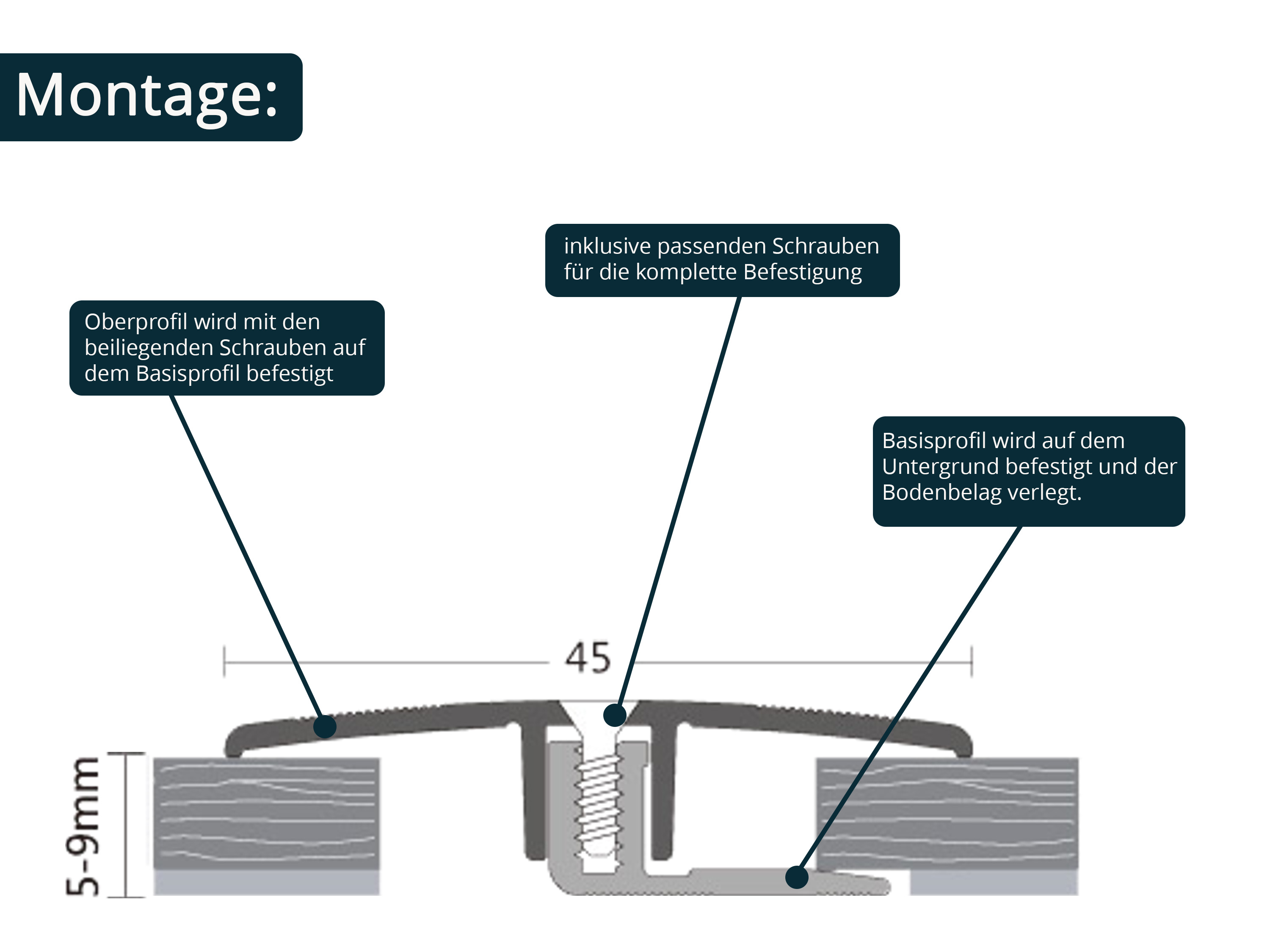 Äußerst stabiles 2-teiliges Abschlussprofil für den Abschluss von Laminat- oder Vinylböden an der Wand, Terrassentüren oder Türschwellen, Sichtbreite 21 mm. Durch die spezielle Konstruktion (automatische, stufenlose Höheneinstellung) für Böden mit einer Belagshöhe von 5-9 mm einsetzbar. Anwendung: Als erstes wird das Basisprofil auf dem Untergrund verschraubt bzw. bei Einsatz einer Warmwasser Fußbodenheizung nach erfolgter Grundierung auf dem Estrich mit Soudal High Tack Montagekleber verklebt. Nach erfolgter Verlegung des Fußbodens wird das Oberprofil auf das Basisprofil aufgelegt. Die beiden Stege greifen über den Schraubkanal des Basisprofils. Mit den beigefügten Schrauben wird es im Schraubkanal befestigt. TIPP: Es ist ratsam sich vom Oberteil des Profils ein kurzes Musterstück (etwa 2 cm) zum Verlegen abzuschneiden. Dadurch wird sichergestellt das die verlegenden Fußboden Dielen optimal zum Basisprofil (Abstand ca. 5-8 mm / Dehnungsfuge) und nicht zu kurz (Abdeckung Oberteil) geschnitten werden.