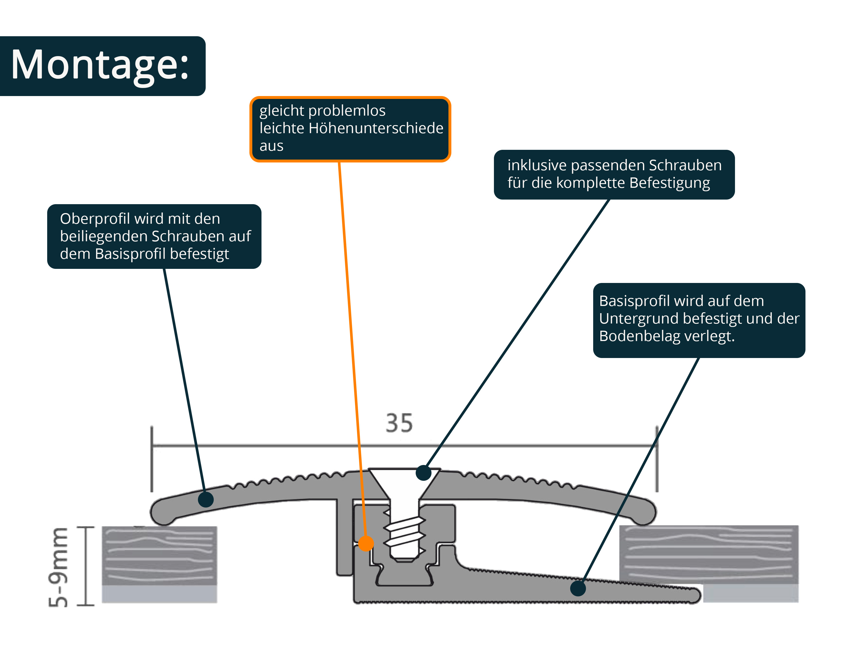 Äußerst stabiles 2-teiliges Abschlussprofil für den Abschluss von Laminat- oder Vinylböden an der Wand, Terrassentüren oder Türschwellen, Sichtbreite 21 mm. Durch die spezielle Konstruktion (automatische, stufenlose Höheneinstellung) für Böden mit einer Belagshöhe von 5-9 mm einsetzbar. Anwendung: Als erstes wird das Basisprofil auf dem Untergrund verschraubt bzw. bei Einsatz einer Warmwasser Fußbodenheizung nach erfolgter Grundierung auf dem Estrich mit Soudal High Tack Montagekleber verklebt. Nach erfolgter Verlegung des Fußbodens wird das Oberprofil auf das Basisprofil aufgelegt. Die beiden Stege greifen über den Schraubkanal des Basisprofils. Mit den beigefügten Schrauben wird es im Schraubkanal befestigt. TIPP: Es ist ratsam sich vom Oberteil des Profils ein kurzes Musterstück (etwa 2 cm) zum Verlegen abzuschneiden. Dadurch wird sichergestellt das die verlegenden Fußboden Dielen optimal zum Basisprofil (Abstand ca. 5-8 mm / Dehnungsfuge) und nicht zu kurz (Abdeckung Oberteil) geschnitten werden.