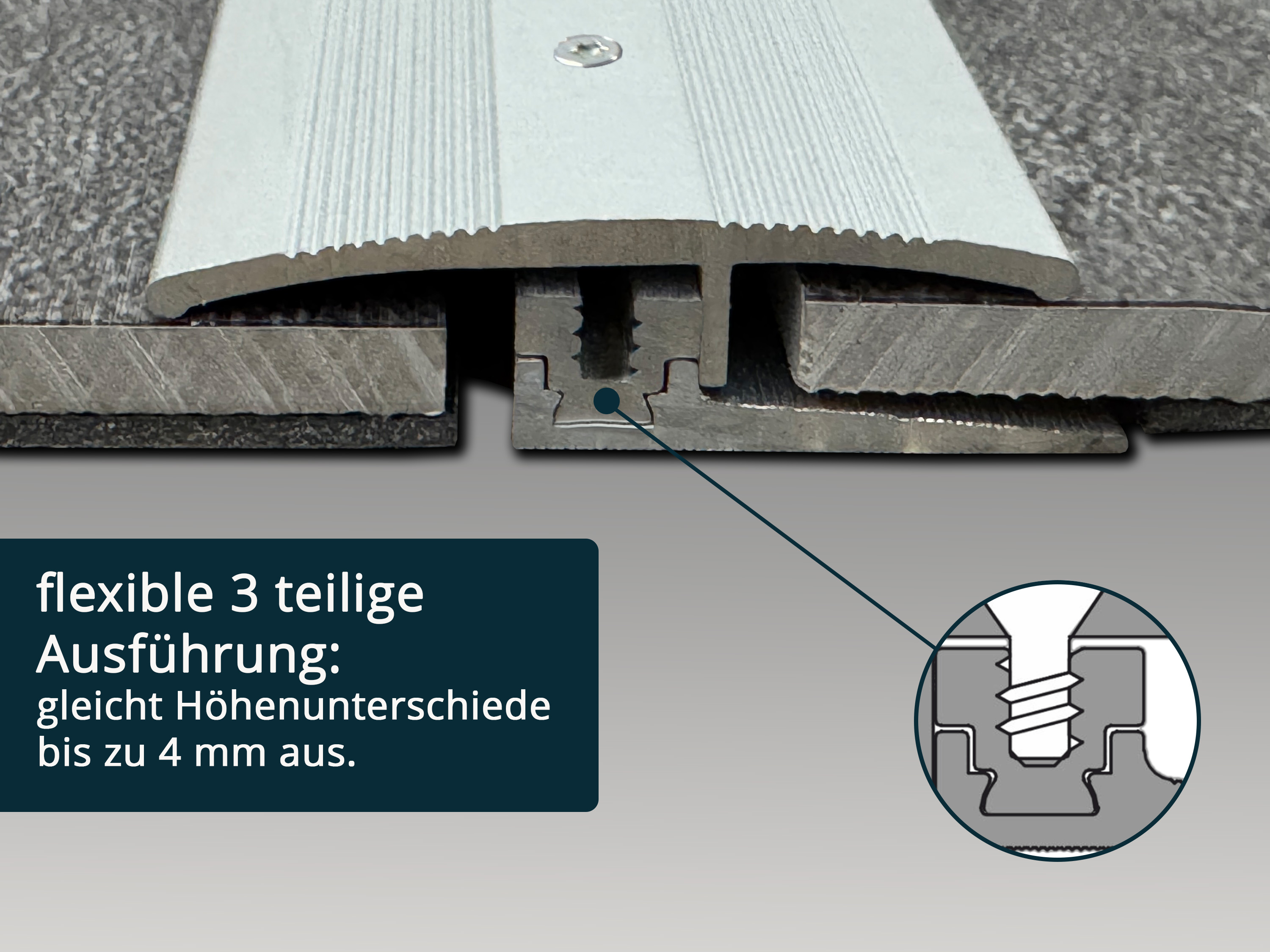 3-teiliges Aluminium Dehnungsfugen-/ Übergangsprofil gleicht Höhenunterschiede bis zu 4 mm problemlos aus