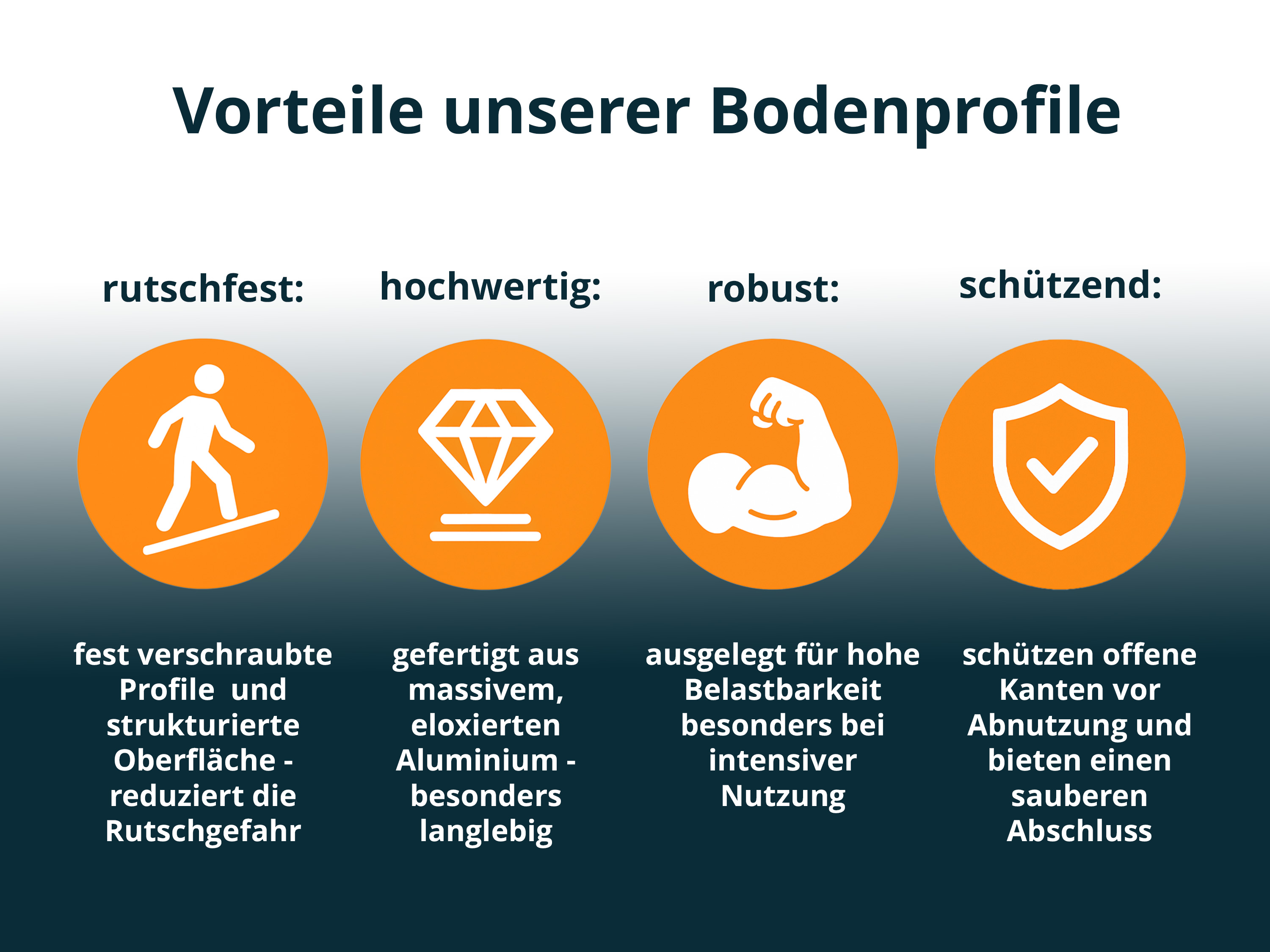 Treppenkantenprofile erhalten Sie bei uns in unterschiedlichen Ausführungen und vielseitigen Aluminium Eloxalfarben. Die kostengünstigste, einfache und schnelle Montage dieser Treppenkantenprofile sprechen für sich. Sie können dieses Treppenkantenprofil auf allen Holz- und Betontreppen sowie für alle Bodenbeläge wie Laminat, Parkettböden usw. verwenden.
