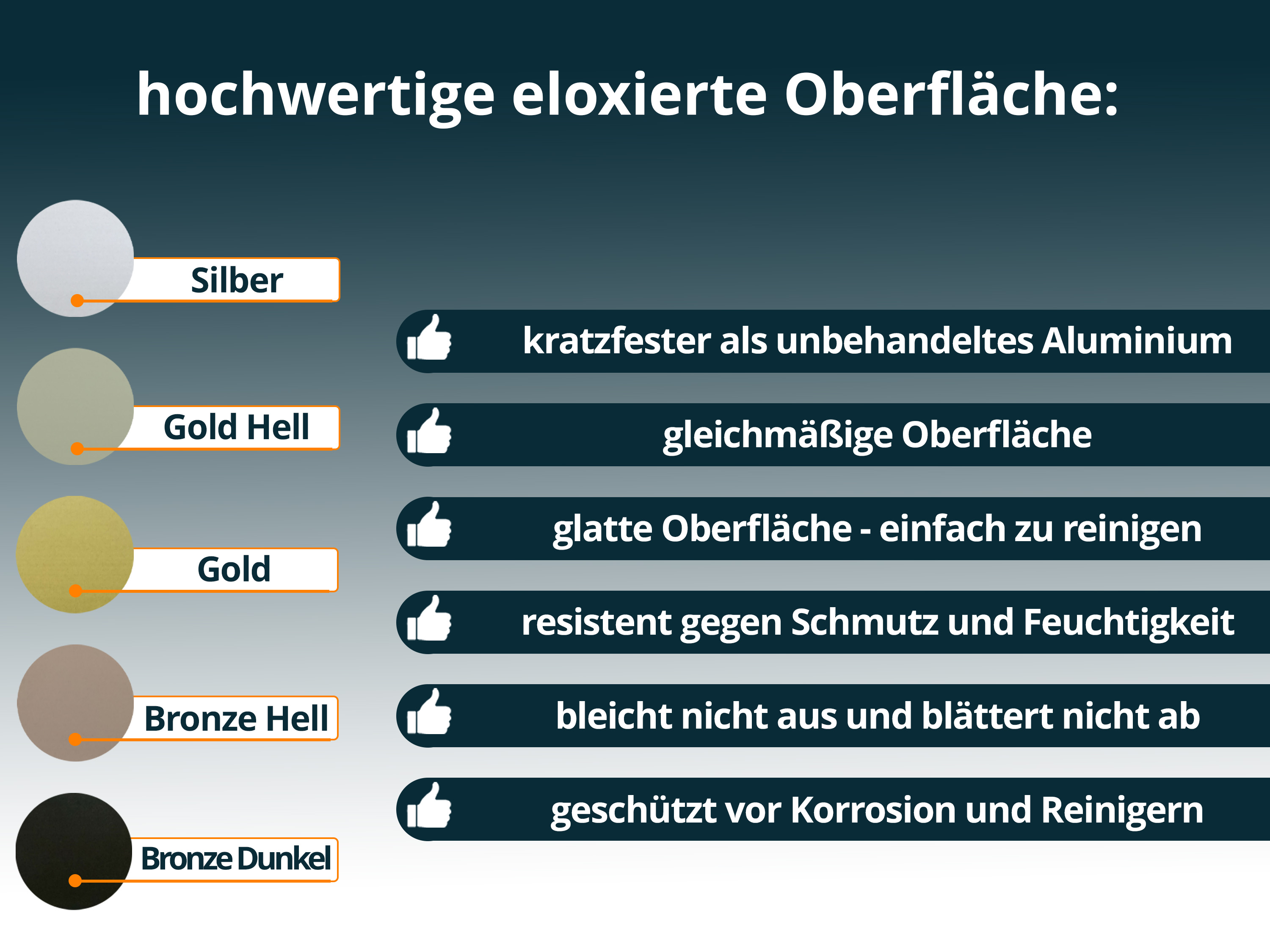 Es stehen 3 Längen gebohrt 100 cm / 124 cm und 250 cm sowie 3 Ausführungen zur Verfügung. Dieses Abschlussprofil dauerhaft eloxiert erhalten Sie in den 5 Farben Silber, Gold, Gold hell, Bronze hell und Bronze dunkel. Der Einsatzmöglichkeit sind keine Grenzen gesetzt.