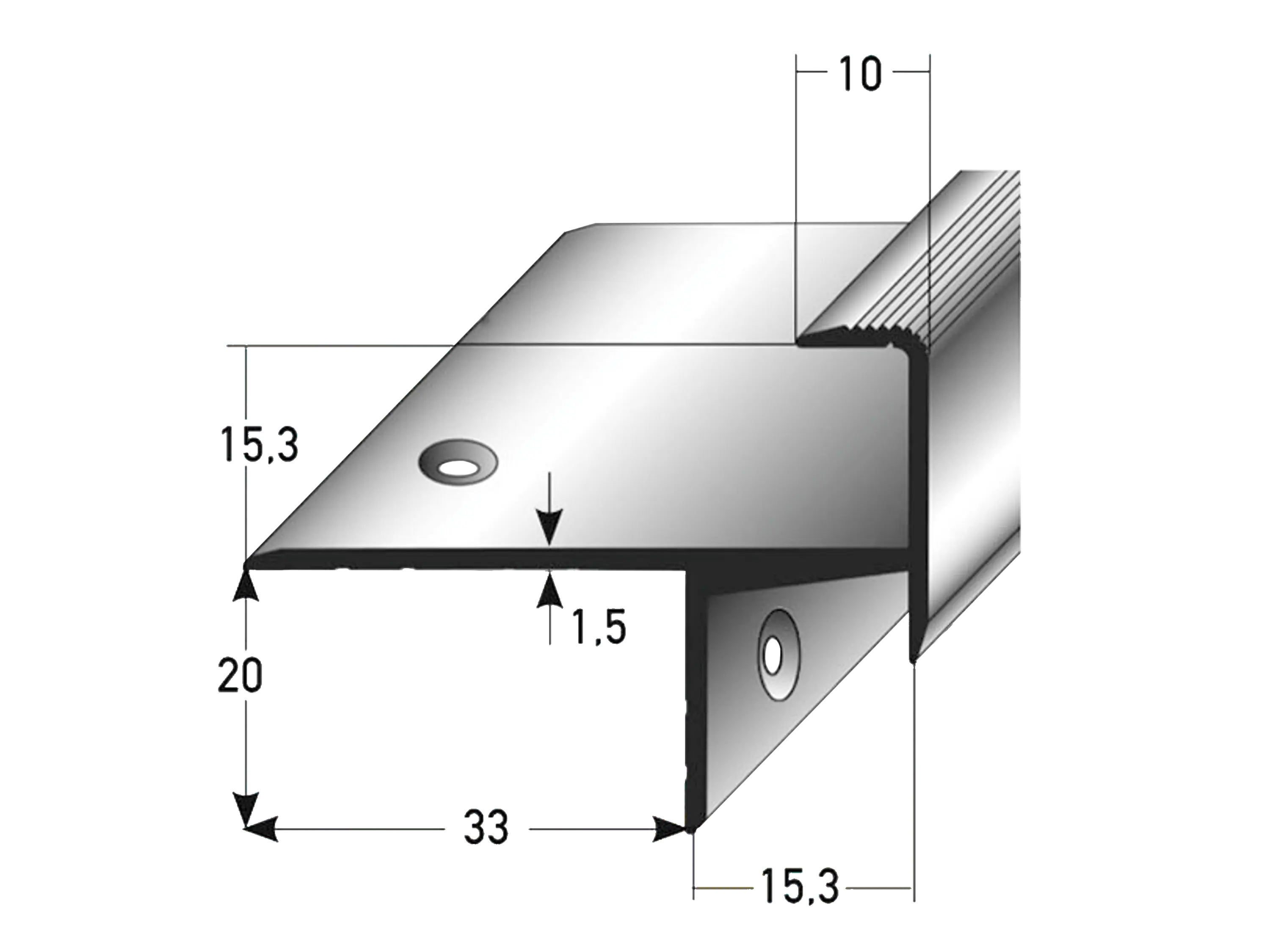Dieses Aluminium-Treppenkantenprofil dient der beidseitigen Verkleidung von Treppenstufen mit Laminatboden. Für alle Treppenstufen sowie Bodenbeläge von 15,3 mm verwendbar. Dieses Alu-Profil wird direkt vor der Laminatverlegung montiert (geschraubt oder geklebt).